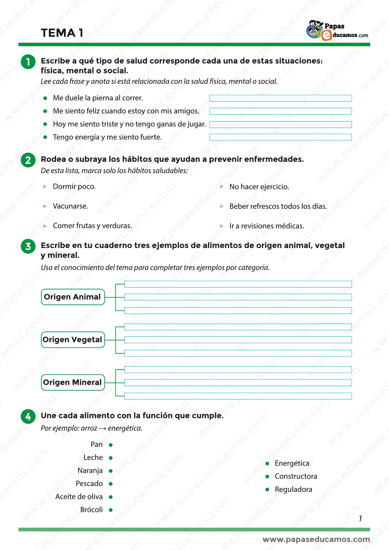 Este tema introduce a los niños en la importancia de la salud física, mental y social, así como en los hábitos necesarios para mantener una vida equilibrada. También se trabajan los alimentos y su clasificación, el ejercicio físico y la postura corporal. Ejercicios ideales para cuarto de primaria.