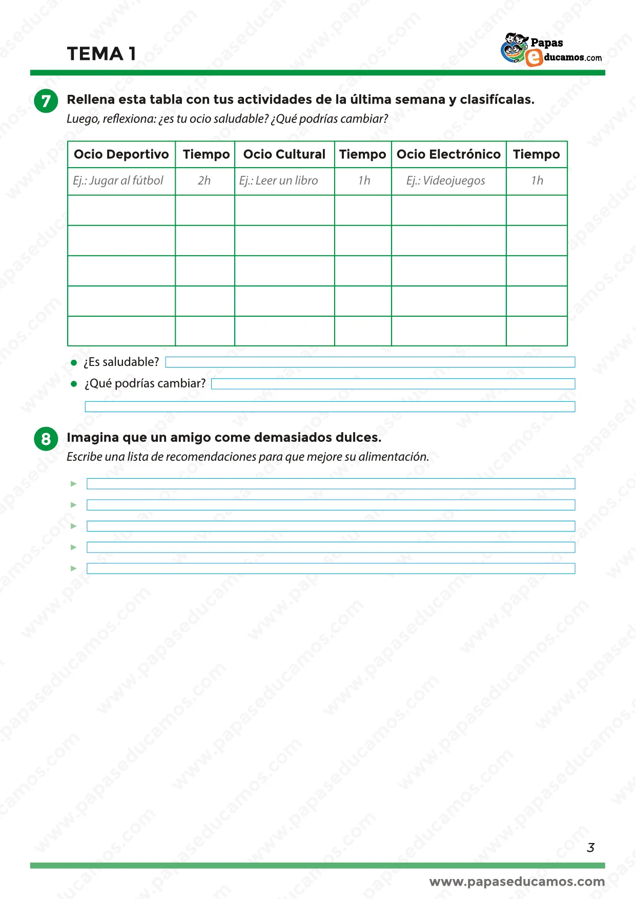 - Organización del Ocio: «Ejercicios para registrar y clasificar las actividades de ocio y reflexionar sobre si son saludables.»