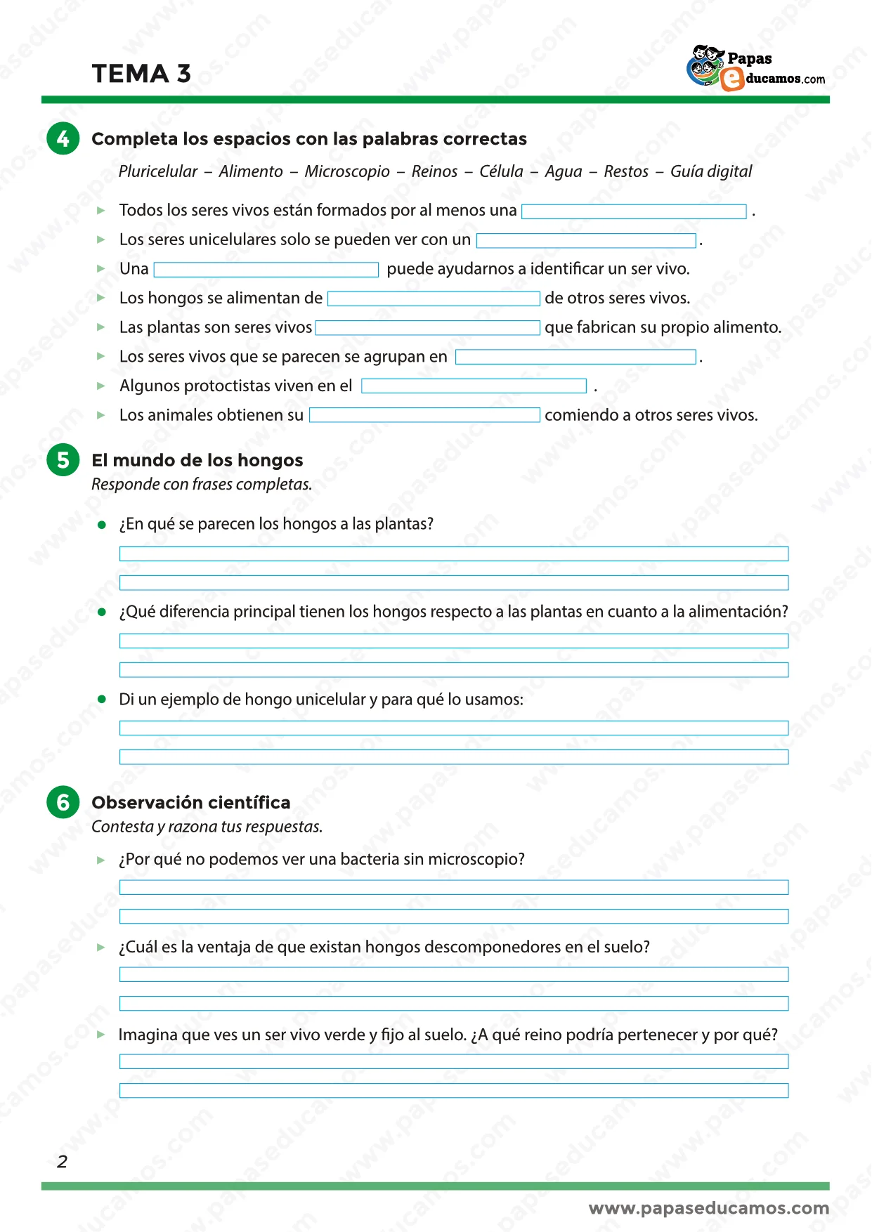 - Completar frases sobre los seres vivos: «Ejercicios para reforzar el concepto de célula, reinos, alimento y medio en que viven.»