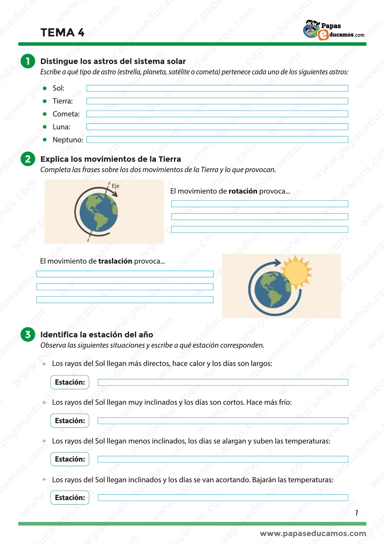 - Estaciones del Año: «Ejercicios para reconocer las estaciones según la posición del Sol y la duración de los días.»