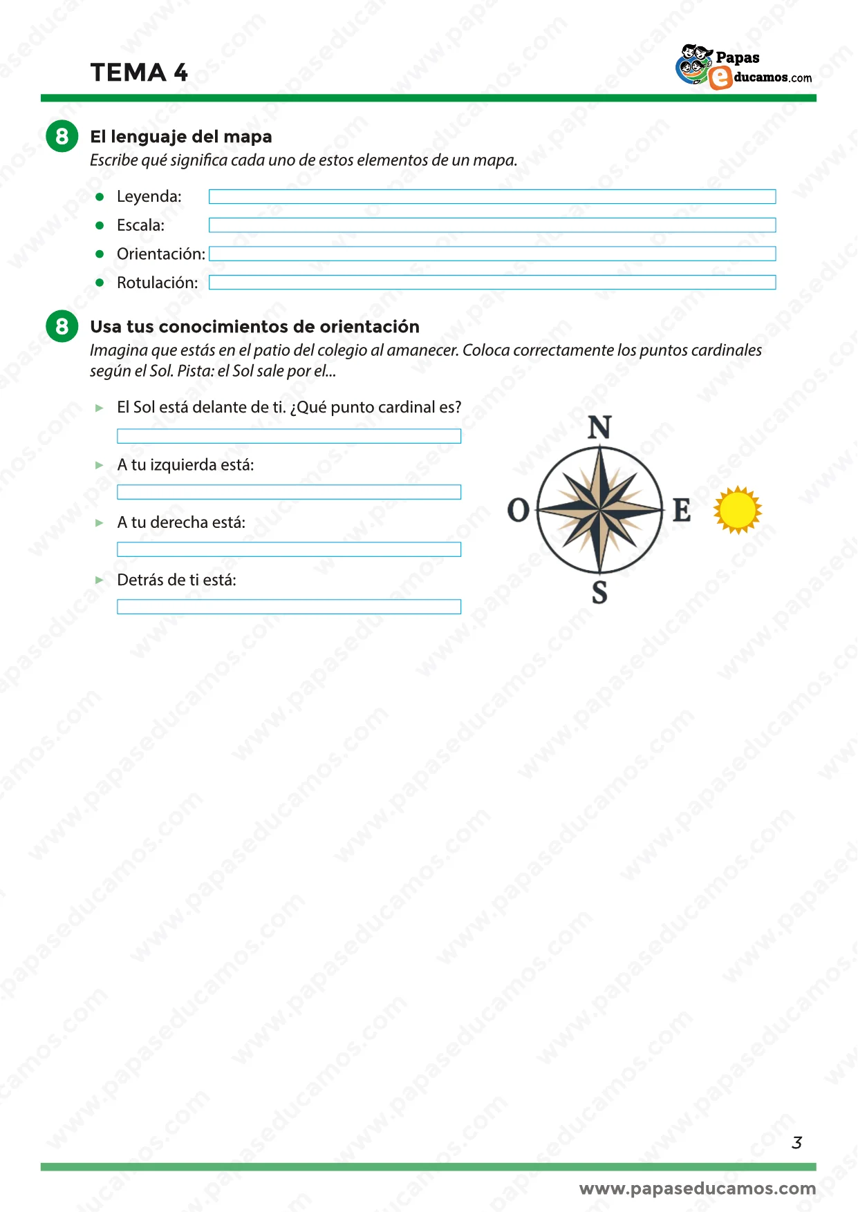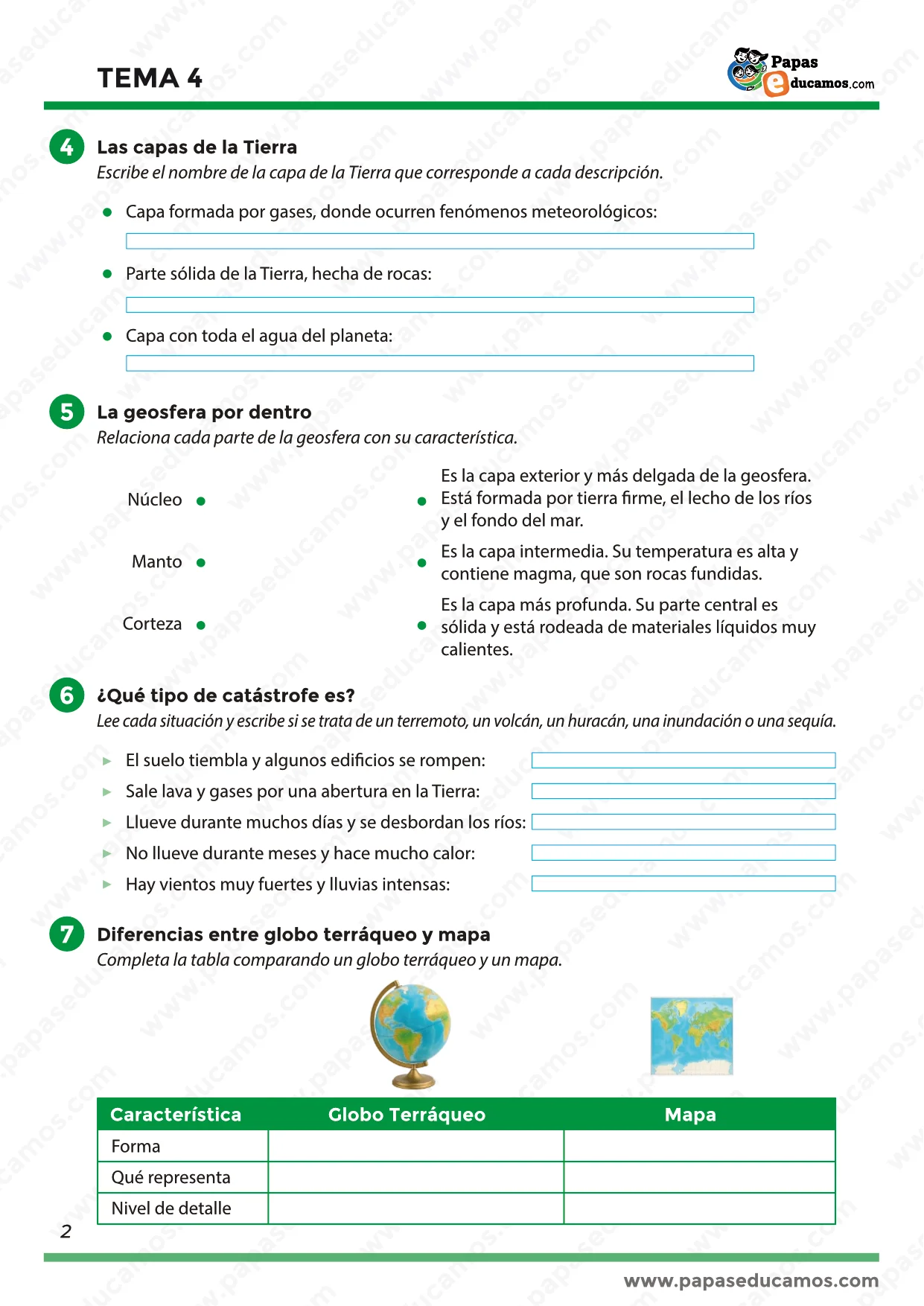 Estudia los astros del sistema solar, los movimientos de la Tierra y las estaciones del año. Aprende las capas de la Tierra y la geosfera, los principales tipos de catástrofes naturales y las diferencias entre globo terráqueo y mapa. También se trabajan los elementos del lenguaje cartográfico y la orientación con puntos cardinales.
