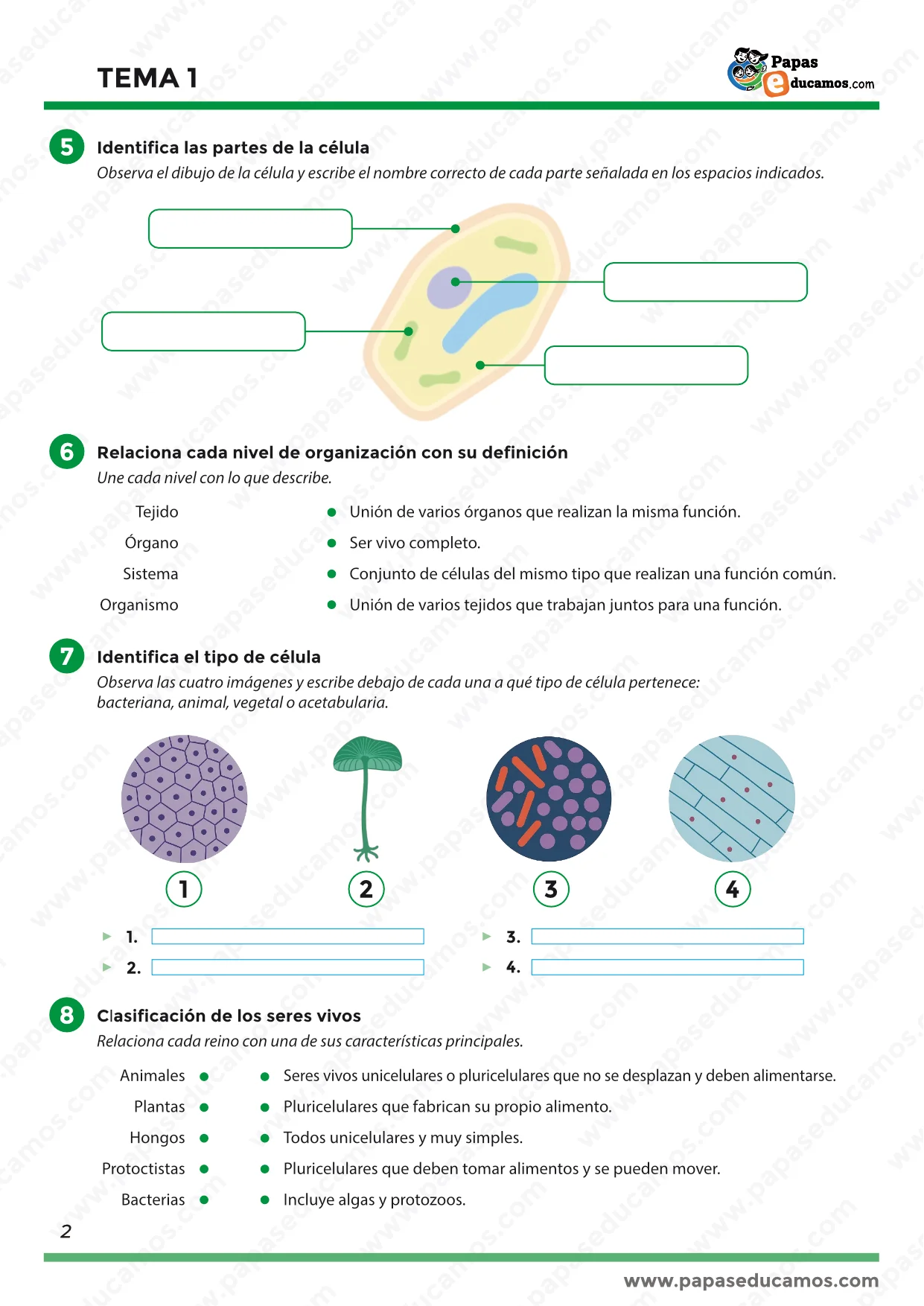 Ejercicios para entender cómo las células se agrupan en tejidos, los tejidos en órganos, los órganos en sistemas y, finalmente, cómo forman un organismo completo.
