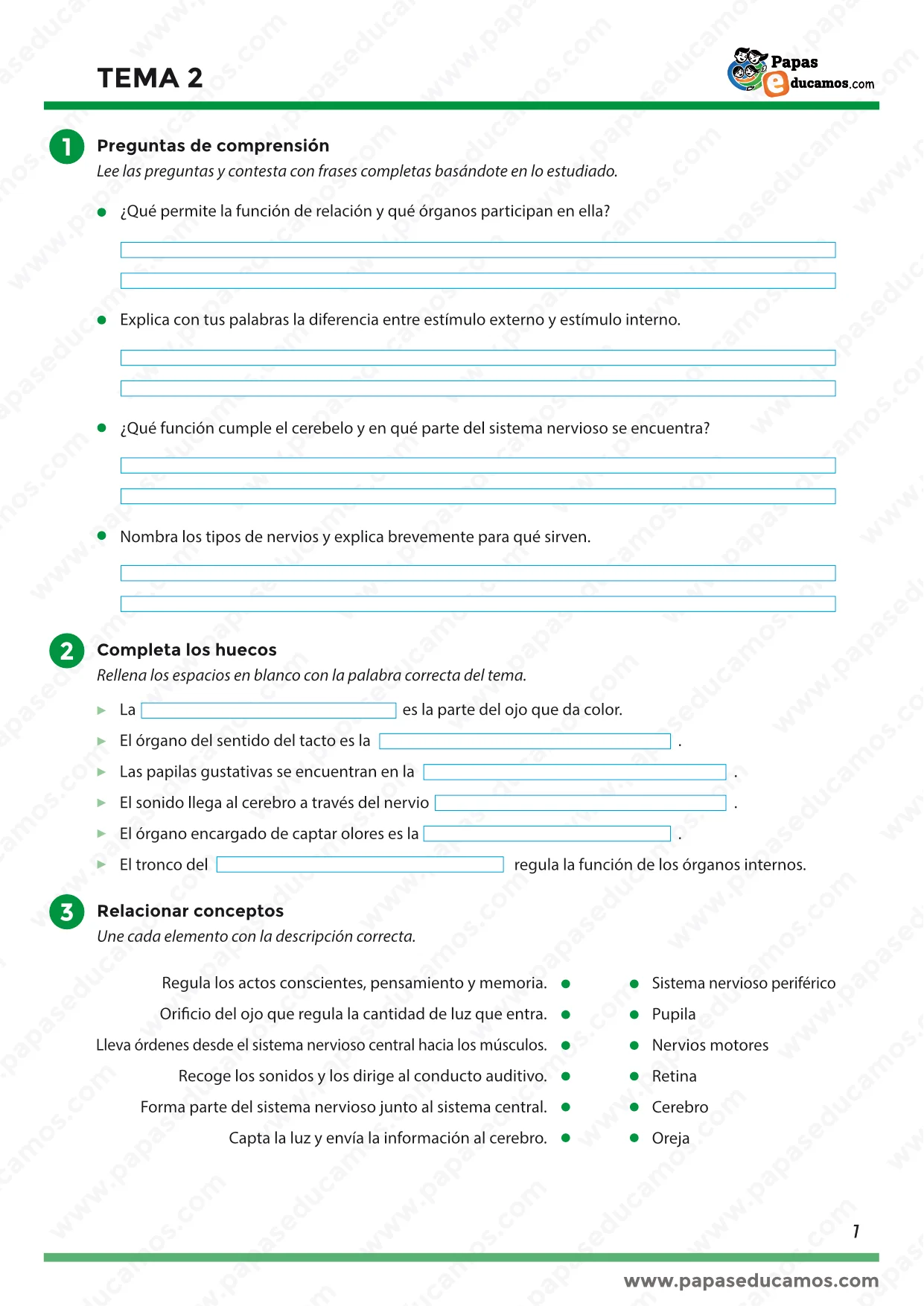 Actividades para descubrir cómo el cuerpo capta información del entorno mediante los sentidos y responde gracias al sistema nervioso. Los alumnos aprenden el papel del cerebro, la médula espinal y los nervios en la coordinación de los movimientos y las reacciones.