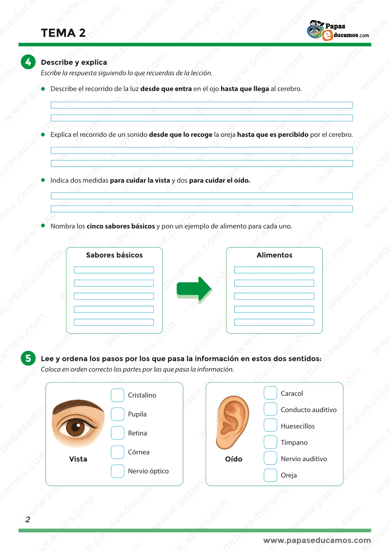 Fichas para describir el recorrido de la luz desde que entra en el ojo hasta llegar al cerebro, y del sonido desde la oreja hasta que es percibido. También se estudian los sabores básicos y cómo se detectan en la lengua.
