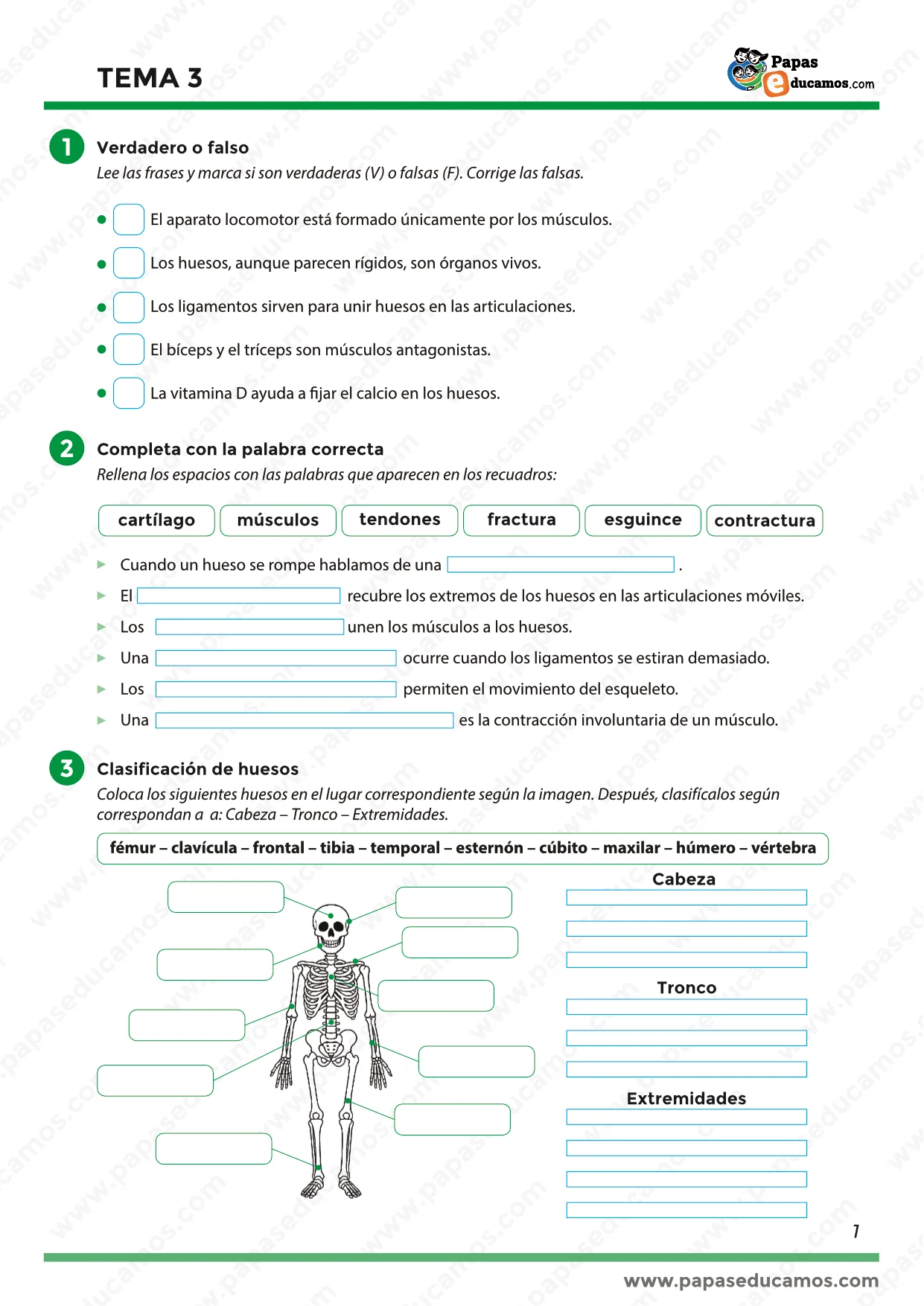 - Clasificación de huesos y músculos: fichas con ilustraciones anatómicas para identificar los principales huesos y músculos del cuerpo, diferenciando entre cabeza, tronco y extremidades.