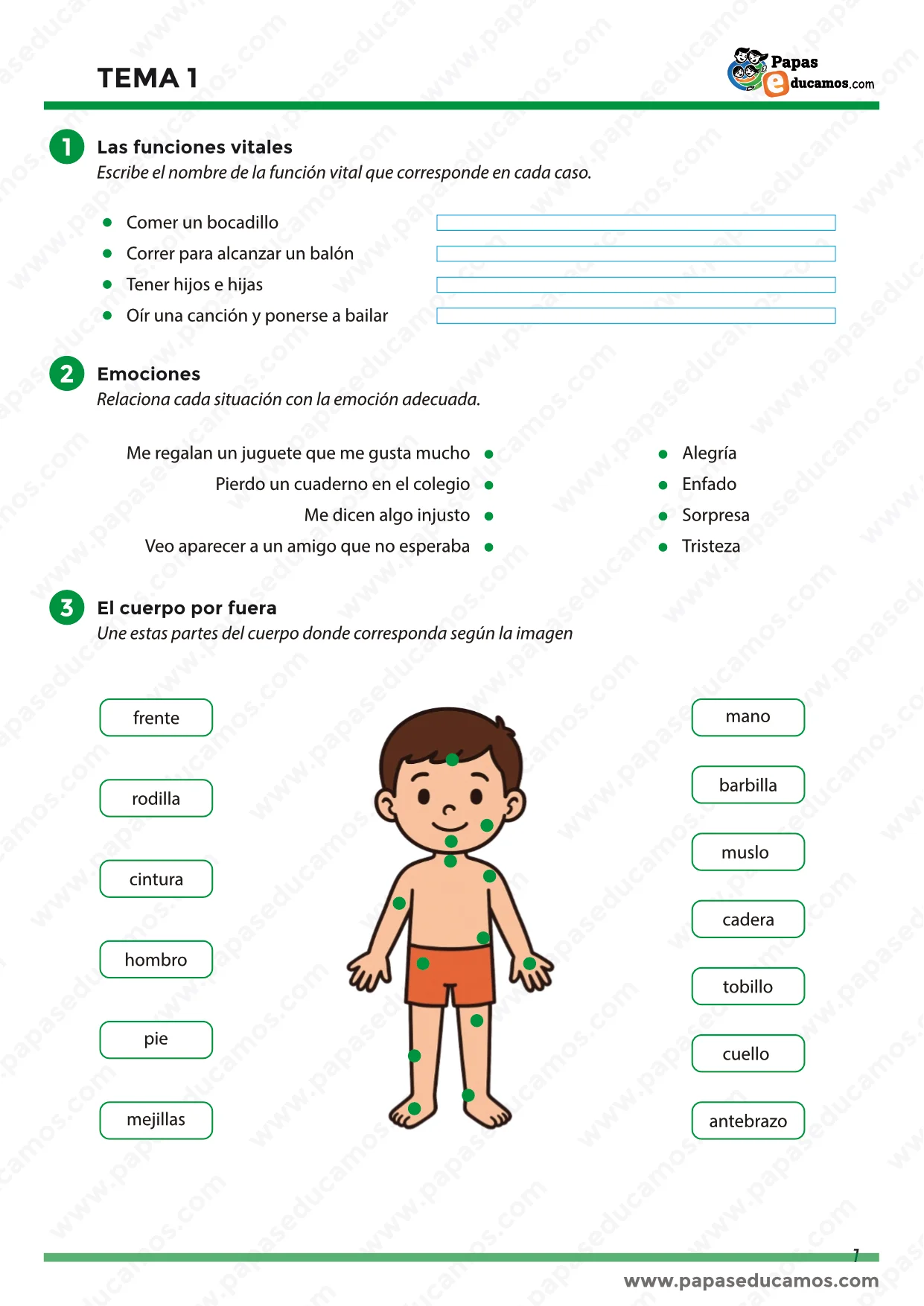 También aborda las emociones, ayudando a reconocer sentimientos como alegría, tristeza, sorpresa o enfado. Se destacan las partes externas del cuerpo y los órganos internos que participan en las funciones vitales.