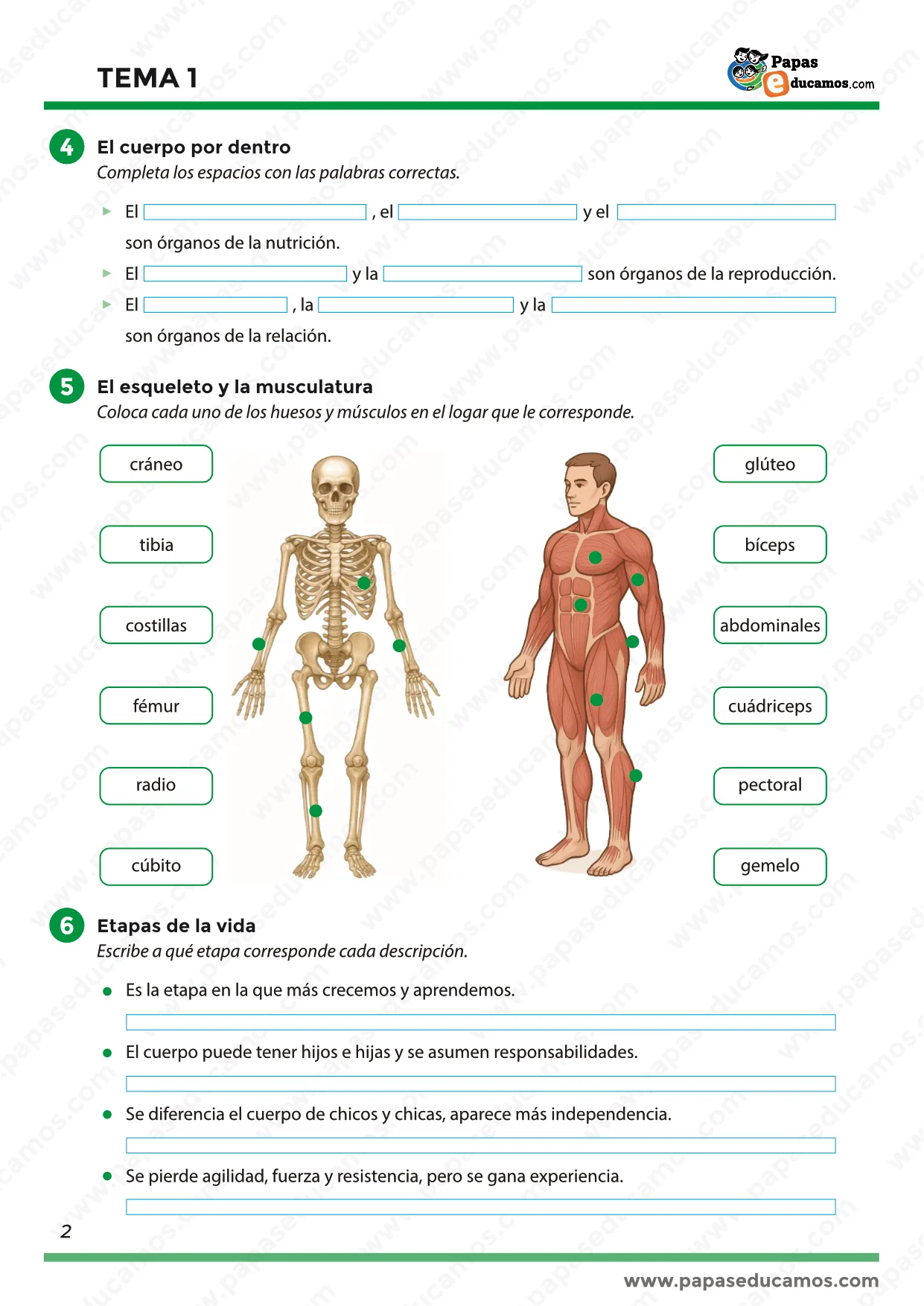 «Ejercicios para localizar huesos y músculos principales en el cuerpo humano, como el cráneo, las costillas, el fémur, los bíceps o los abdominales.»