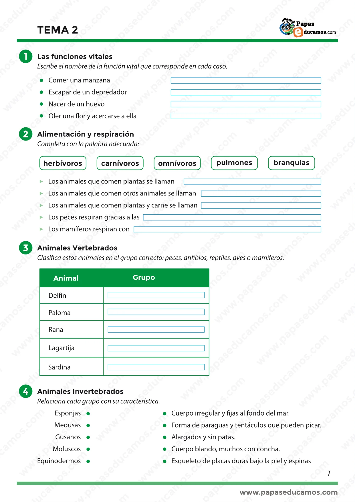 - Funciones vitales de los vertebrados: ejercicios para identificar las tres funciones esenciales —nutrición, relación y reproducción— y asociarlas con ejemplos reales de animales.
