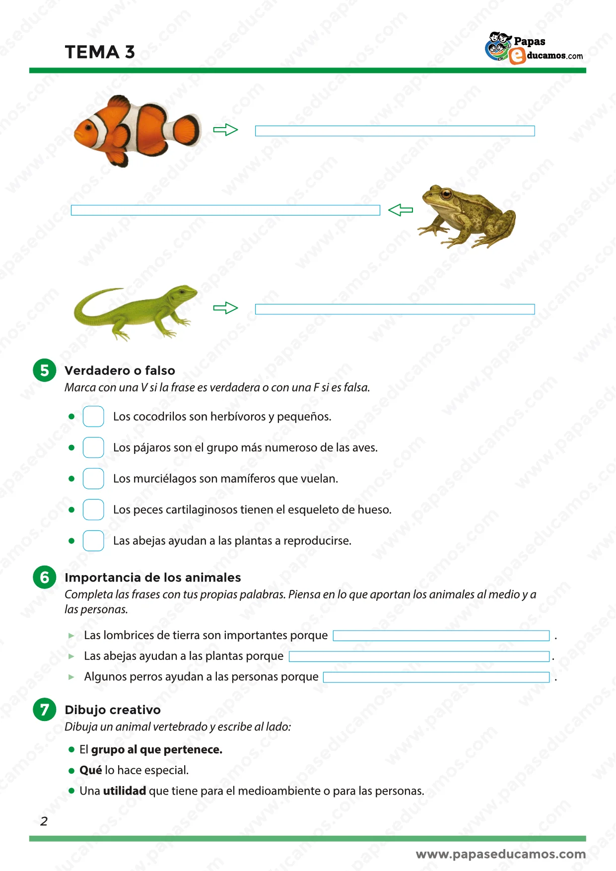 - Dibujo creativo: espacio para que los alumnos representen un animal vertebrado, identifiquen su grupo y expliquen su utilidad para el entorno.