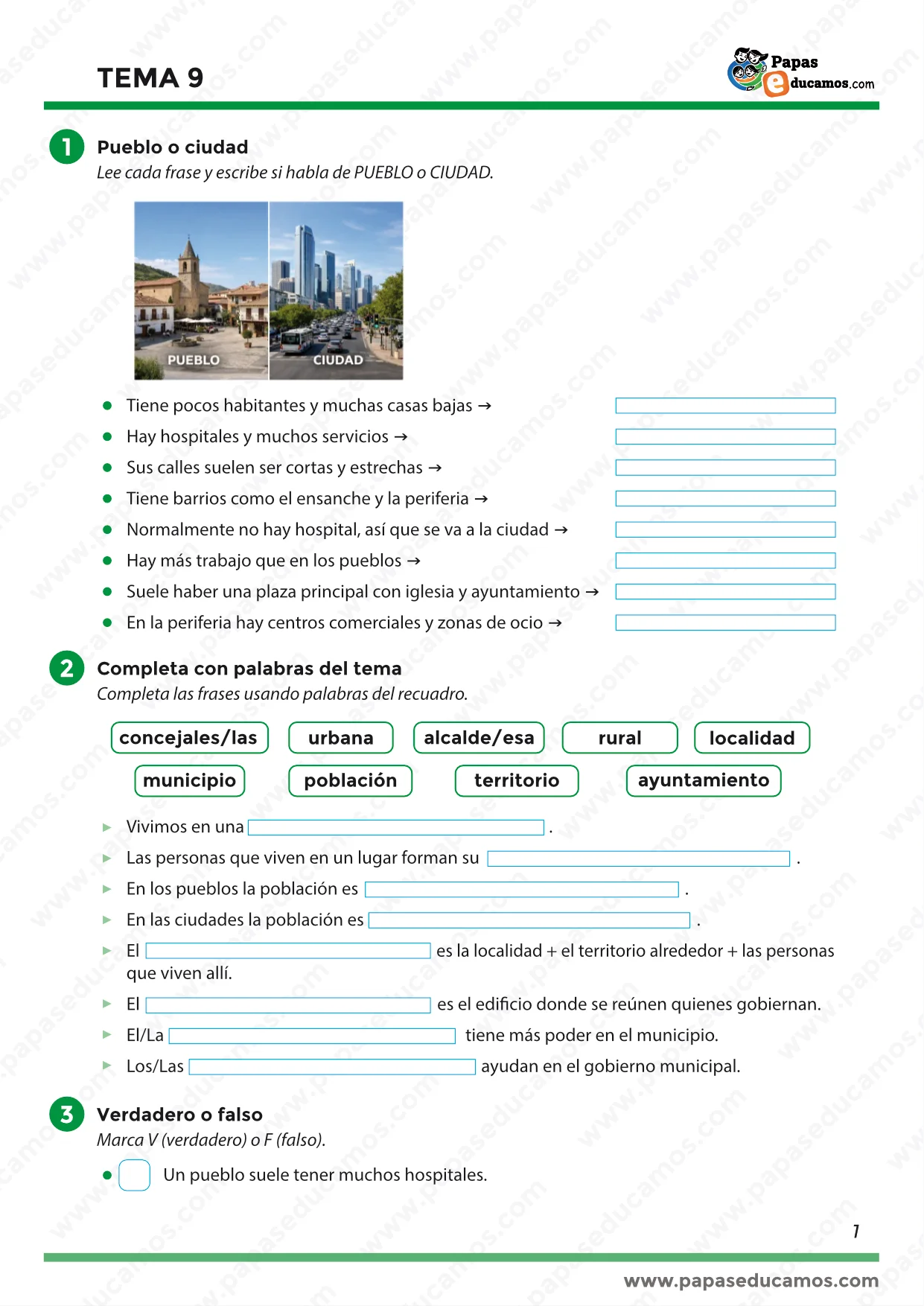 A continuación, se repasan ideas importantes con un bloque de verdadero o falso, que ayuda a corregir confusiones típicas (por ejemplo, creer que el barrio antiguo es lo más nuevo o que un pueblo tiene muchos hospitales). Por otro lado, se trabajan las zonas de la ciudad (barrio antiguo, ensanche y periferia) relacionando descripciones con cada zona, y se completa una comparación breve entre pueblos y ciudades para consolidar lo aprendido.