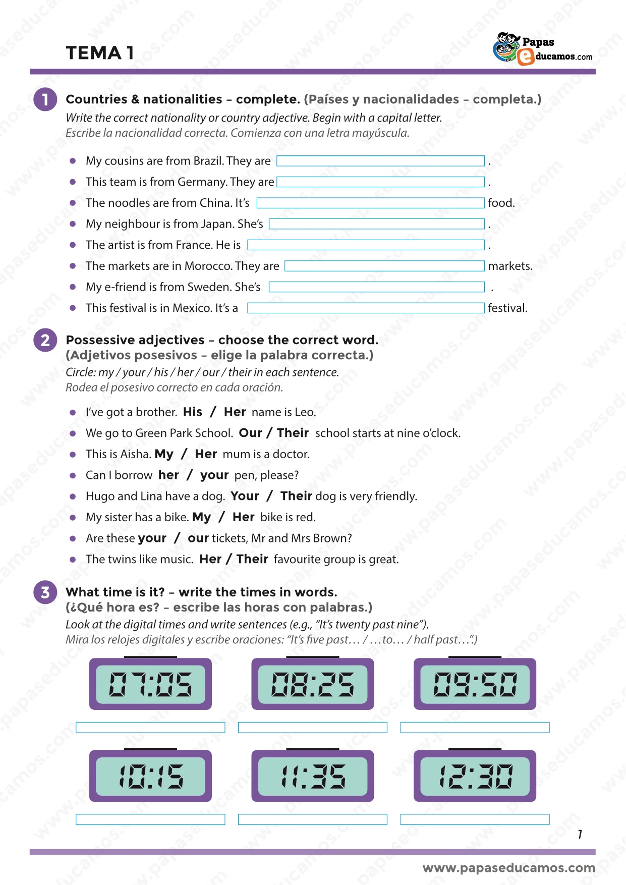 En esta primera unidad, los alumnos aprenden a identificar países, nacionalidades, posesivos y expresiones relacionadas con la hora y las rutinas diarias. A través de actividades interactivas y ejercicios escritos, desarrollan su comprensión lectora, vocabulario básico y expresión escrita en inglés.