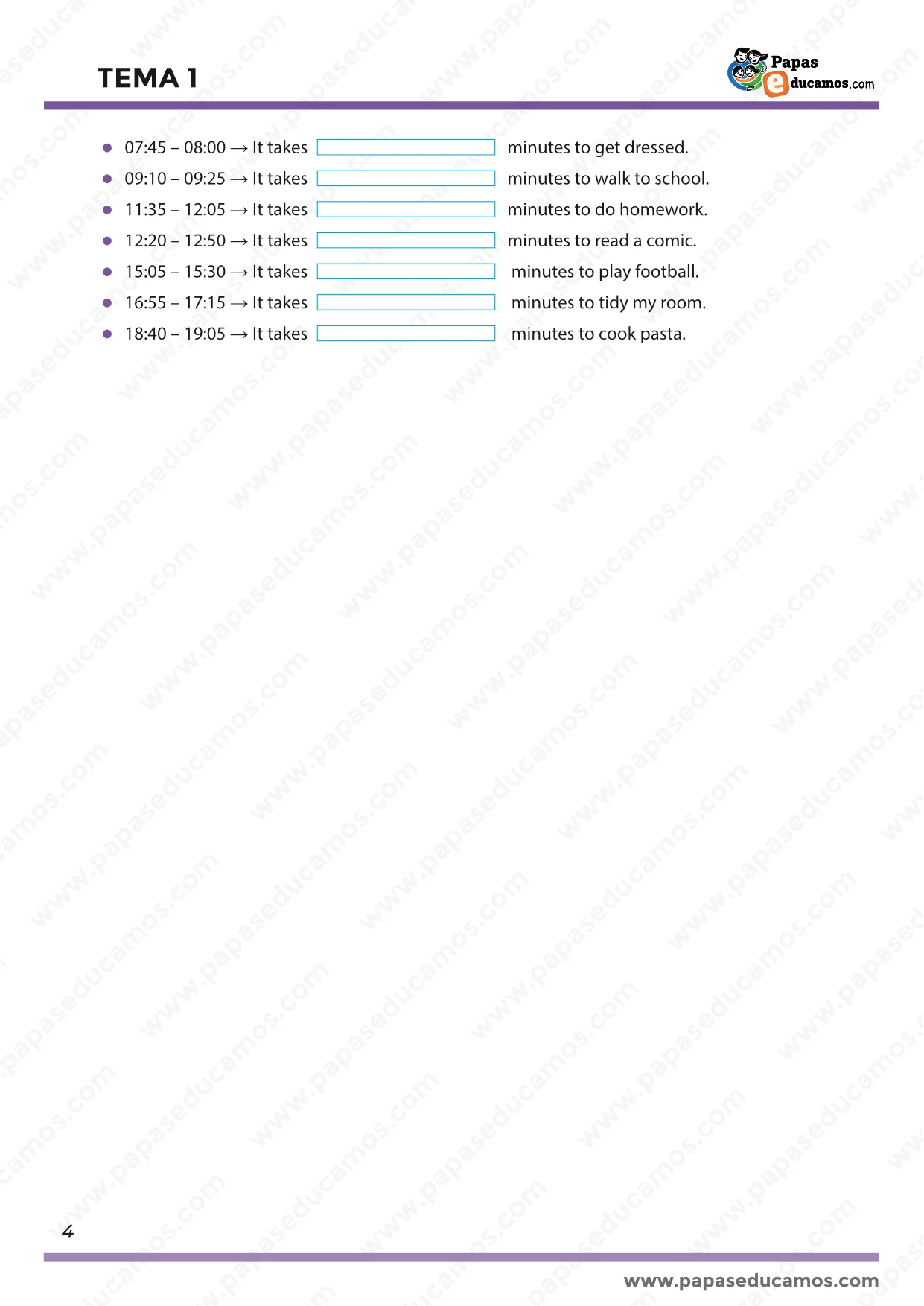 Ejercicios para calcular la duración de diferentes actividades cotidianas (leer, cocinar, hacer deberes, jugar, etc.) expresadas en minutos.