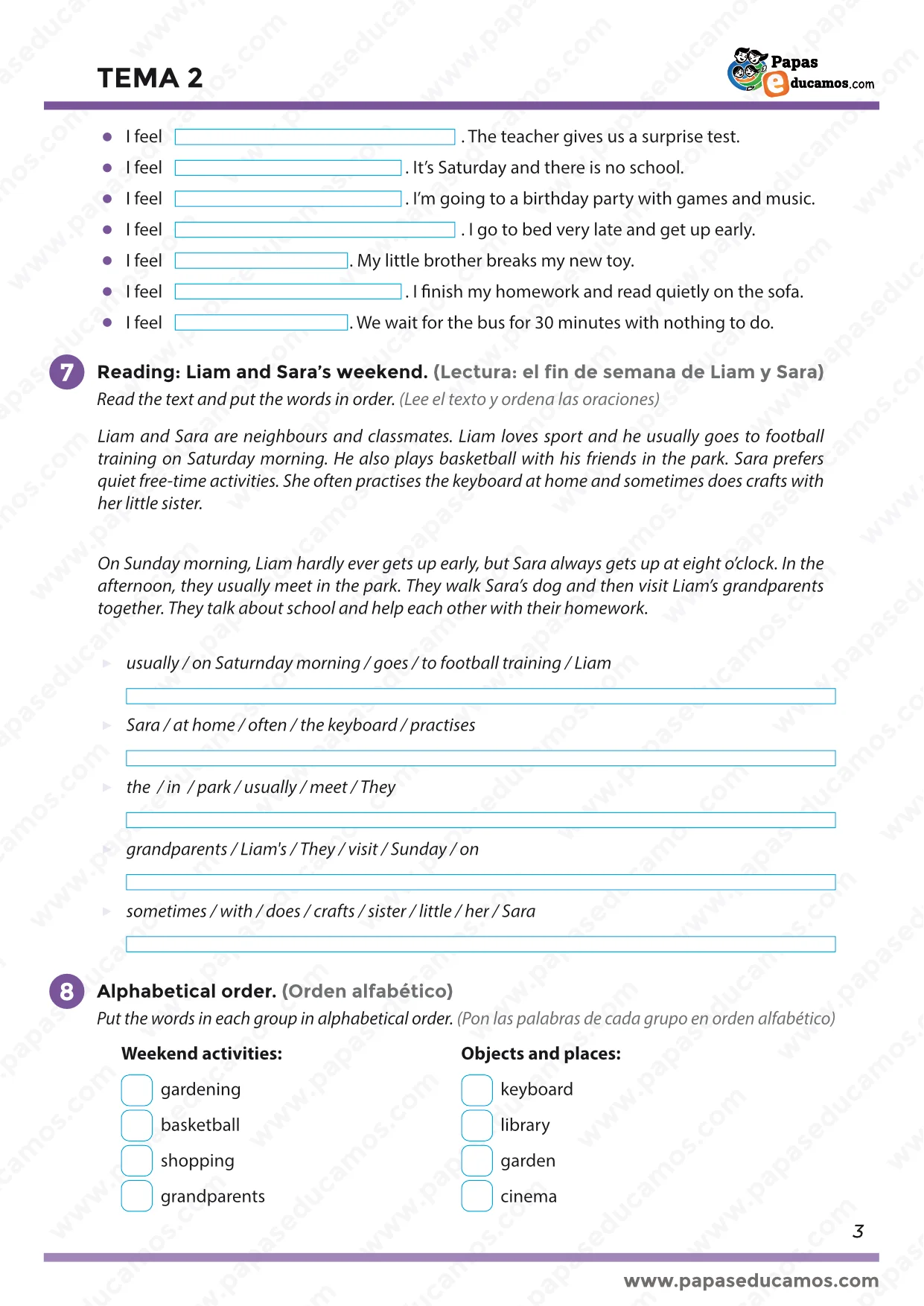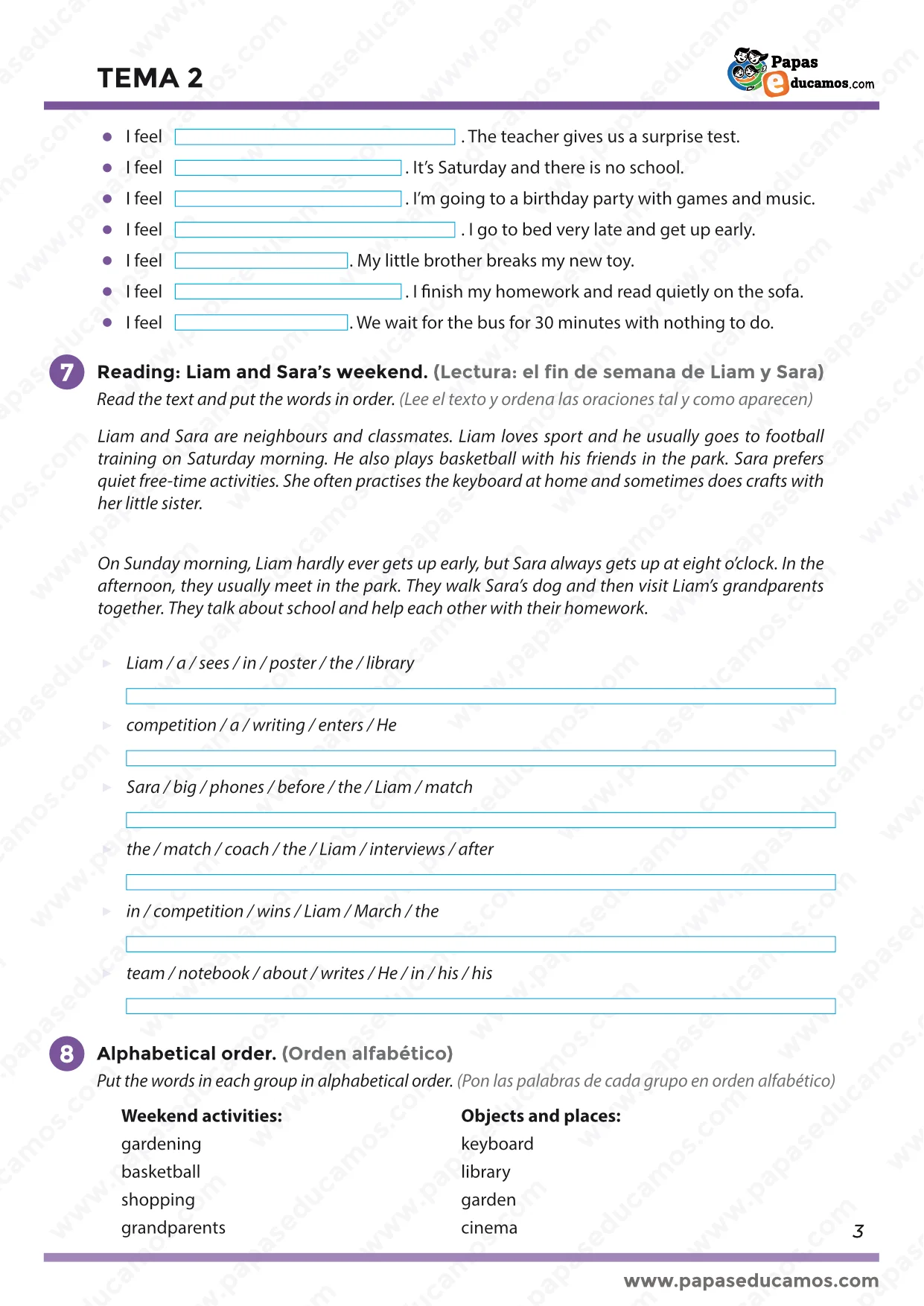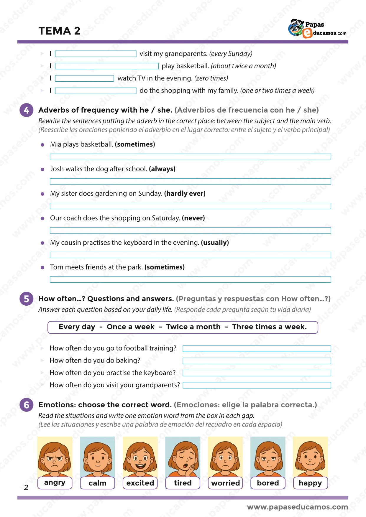 En la sección 6 identifican emociones básicas (angry, calm, excited, tired, worried, bored, happy) según distintas situaciones (página 2 y 3). Es una actividad ideal para trabajar la educación emocional y el vocabulario práctico del día a día.