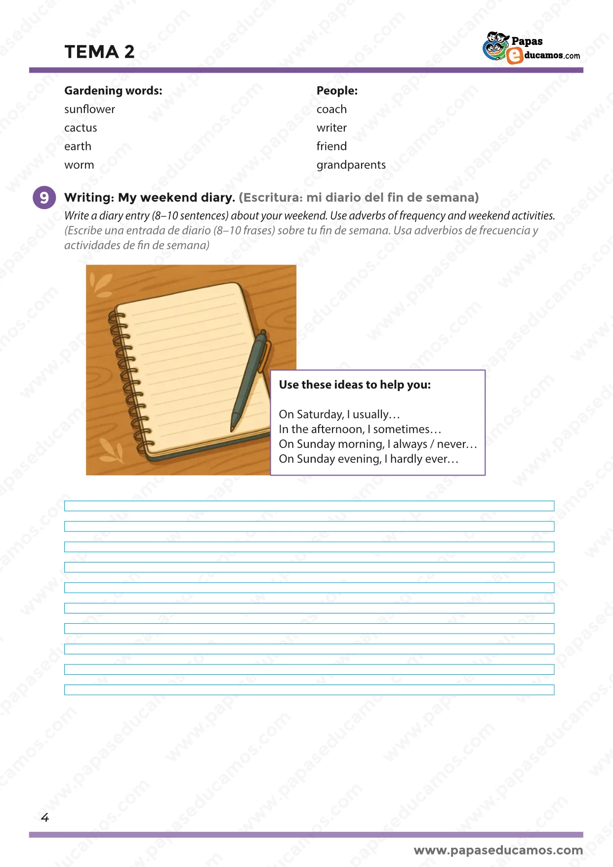 Finalmente, en la página 4, escriben un diario de 8–10 frases usando adverbios de frecuencia y actividades del fin de semana.