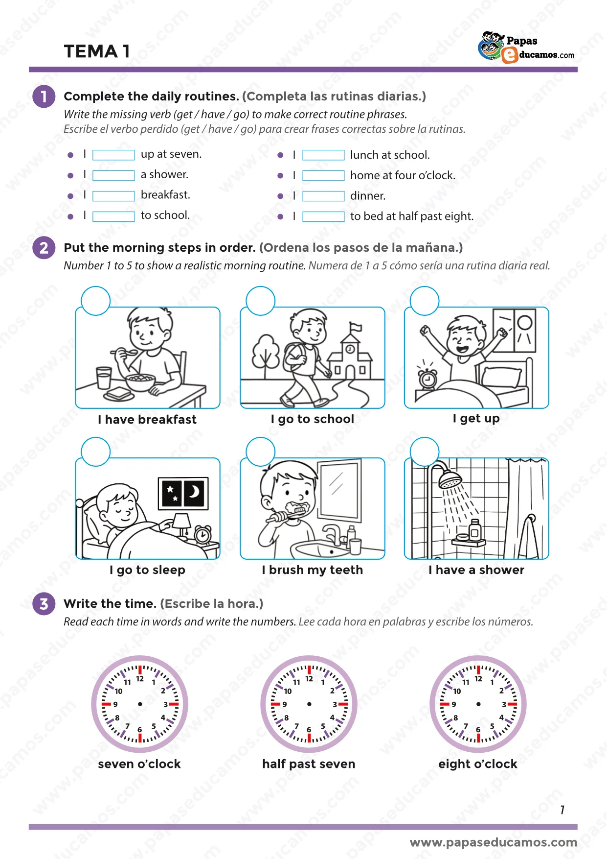 - Completar frases de rutinas con los verbos adecuados (get, have, go).