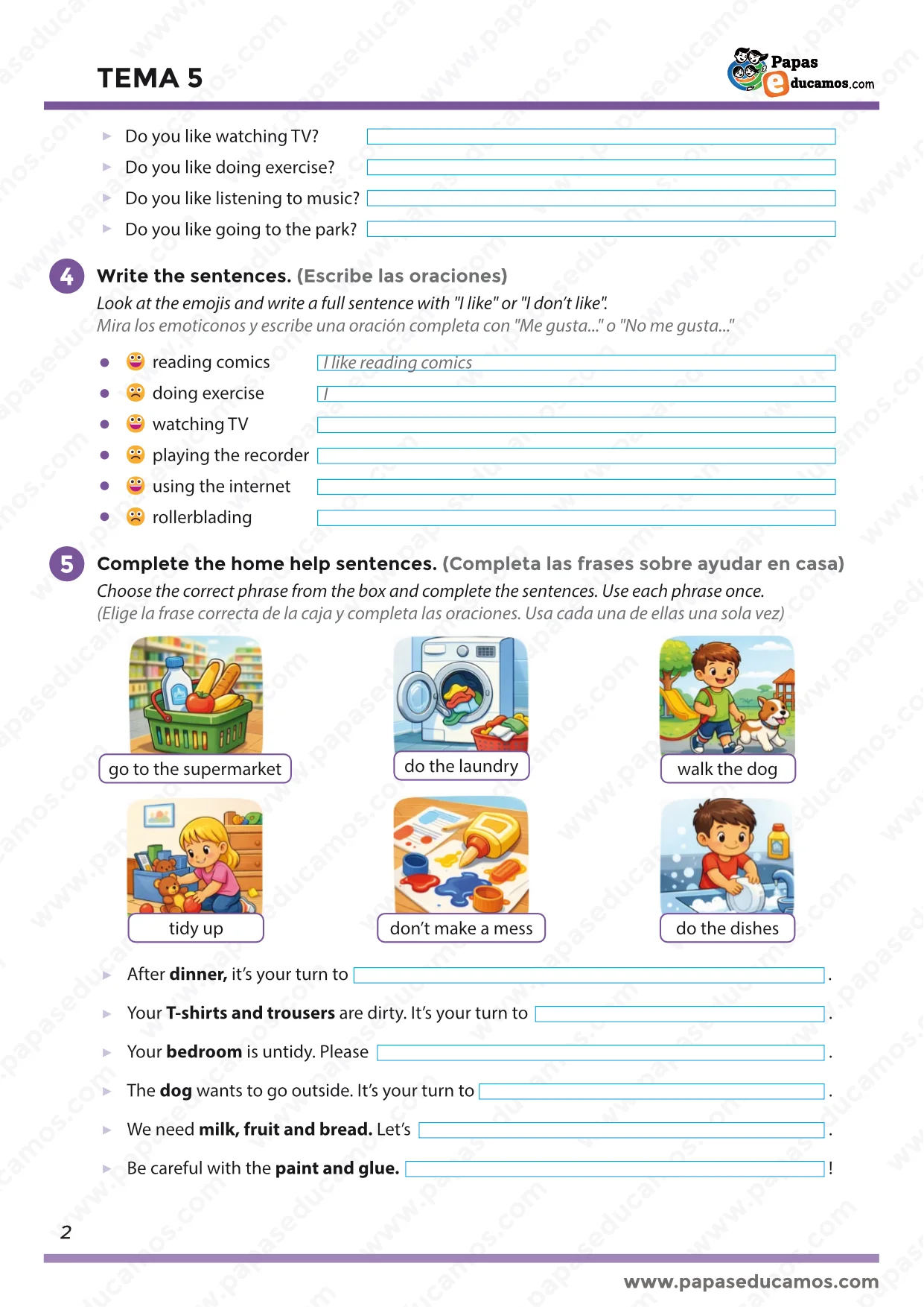 - Ayuda en casa (home help): do the dishes, do the laundry, tidy up, walk the dog, go to the supermarket, don’t make a mess completando situaciones.