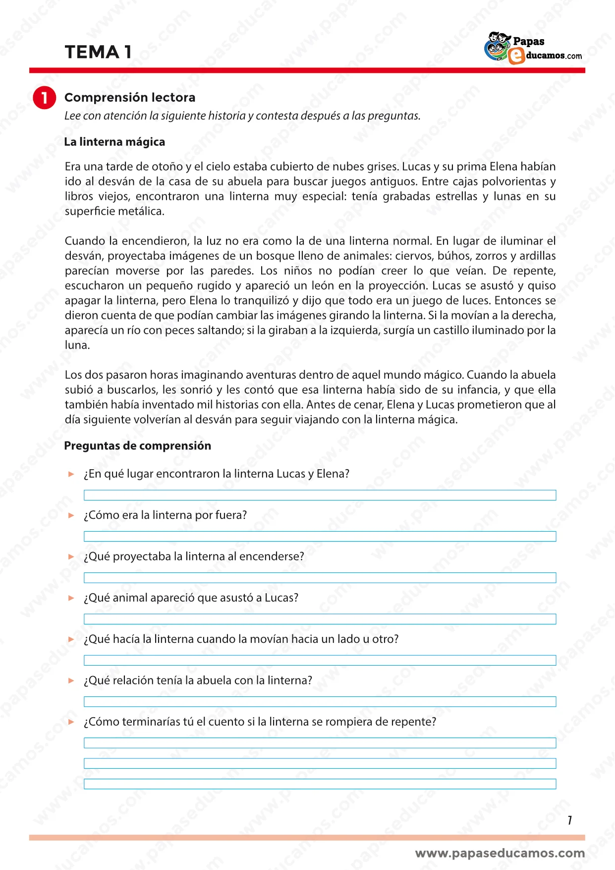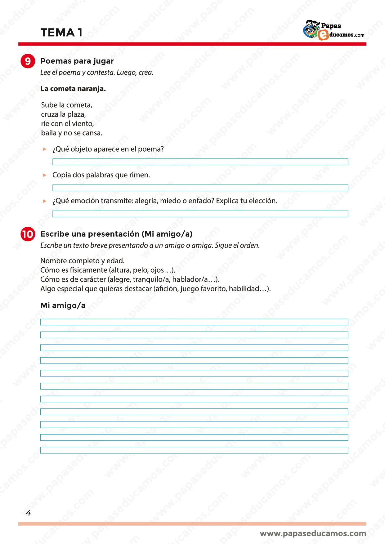 Este tema introduce a los alumnos en el desarrollo de la comprensión lectora, la ortografía y la expresión escrita de manera divertida y cercana. Se trabaja a través de cuentos, dictados, poemas y actividades relacionadas con la vida diaria.