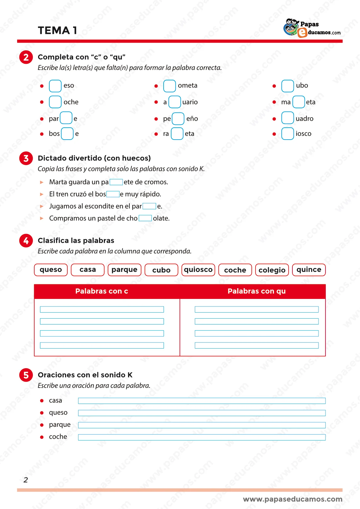 «Ejercicios para completar palabras con c o qu, dictados con huecos y clasificación de palabras según su escritura.»