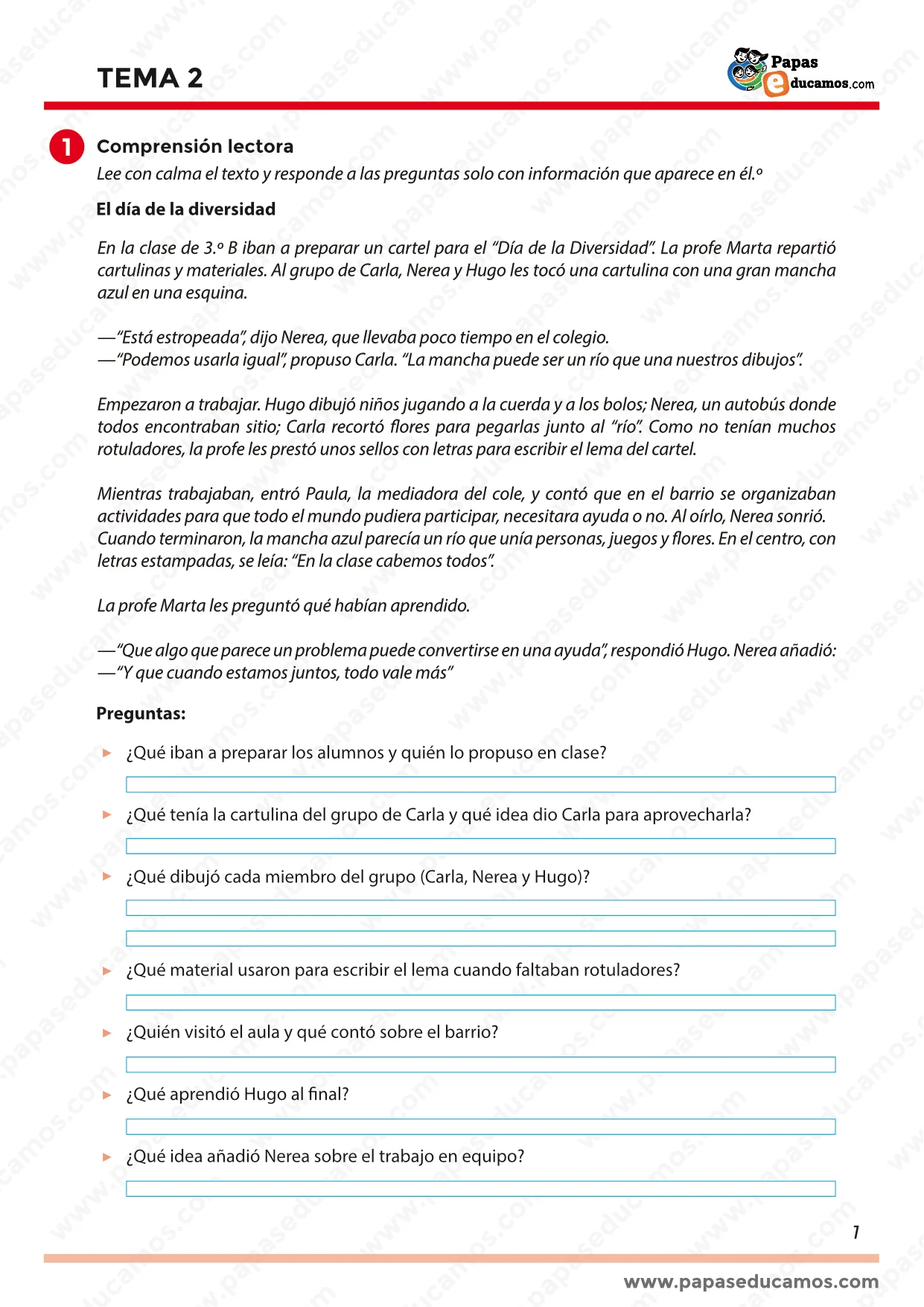 - Comprensión lectora: “El día de la diversidad”, un texto que enseña valores de cooperación y trabajo en equipo.