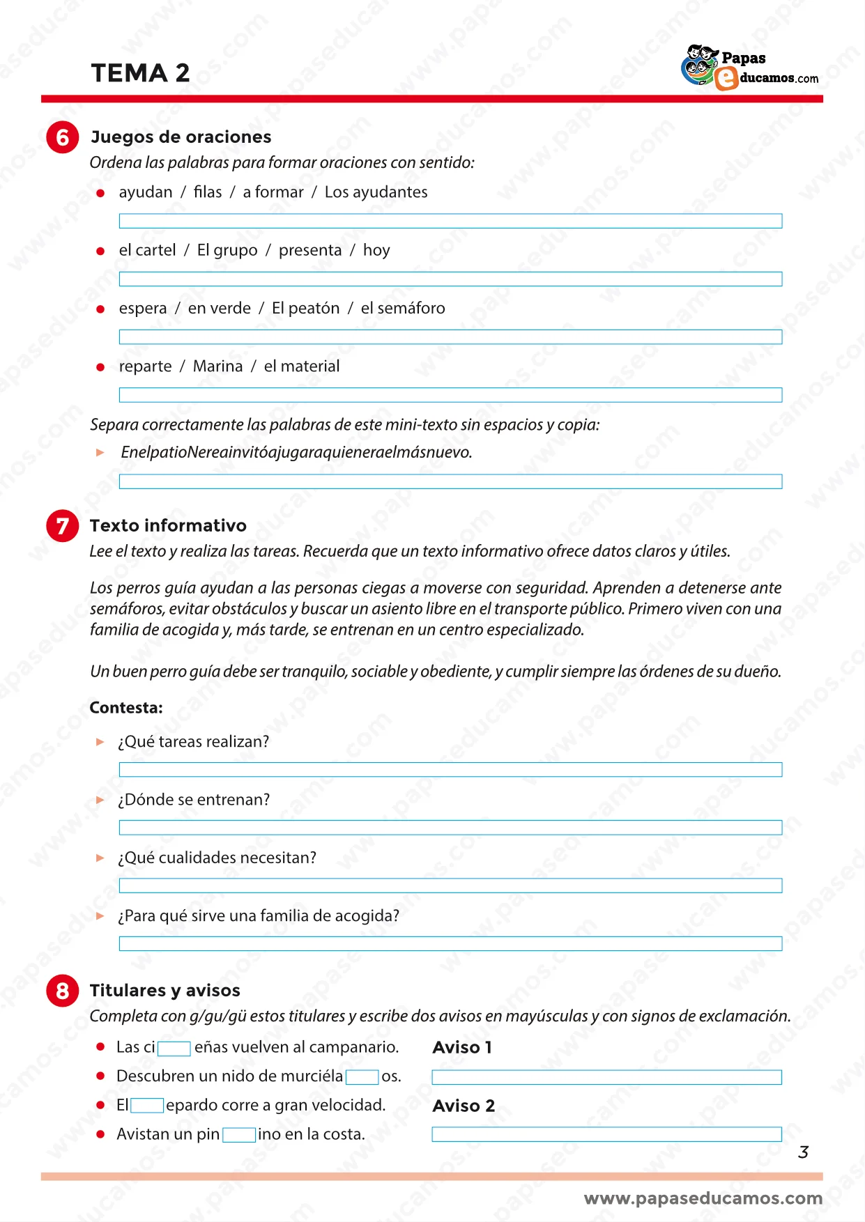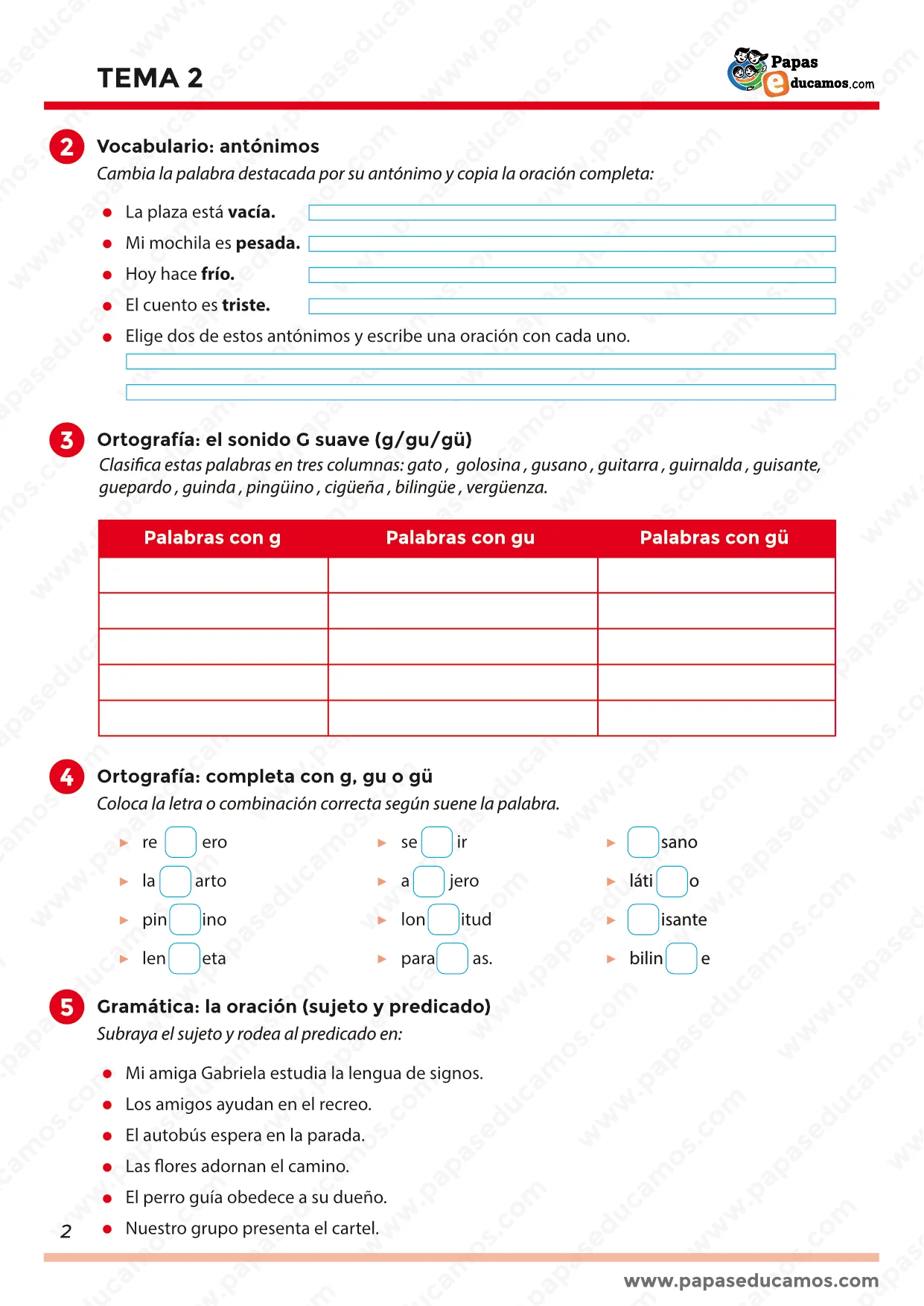 En el Tema 2, los alumnos trabajan de manera práctica y divertida la comprensión lectora, el uso de antónimos, la ortografía del sonido G suave (g, gu, gü), y la estructura de la oración (sujeto y predicado). Además, se incluyen ejercicios de ordenar palabras, textos informativos y titulares periodísticos, promoviendo la lectura comprensiva, la expresión escrita y la ampliación del vocabulario.