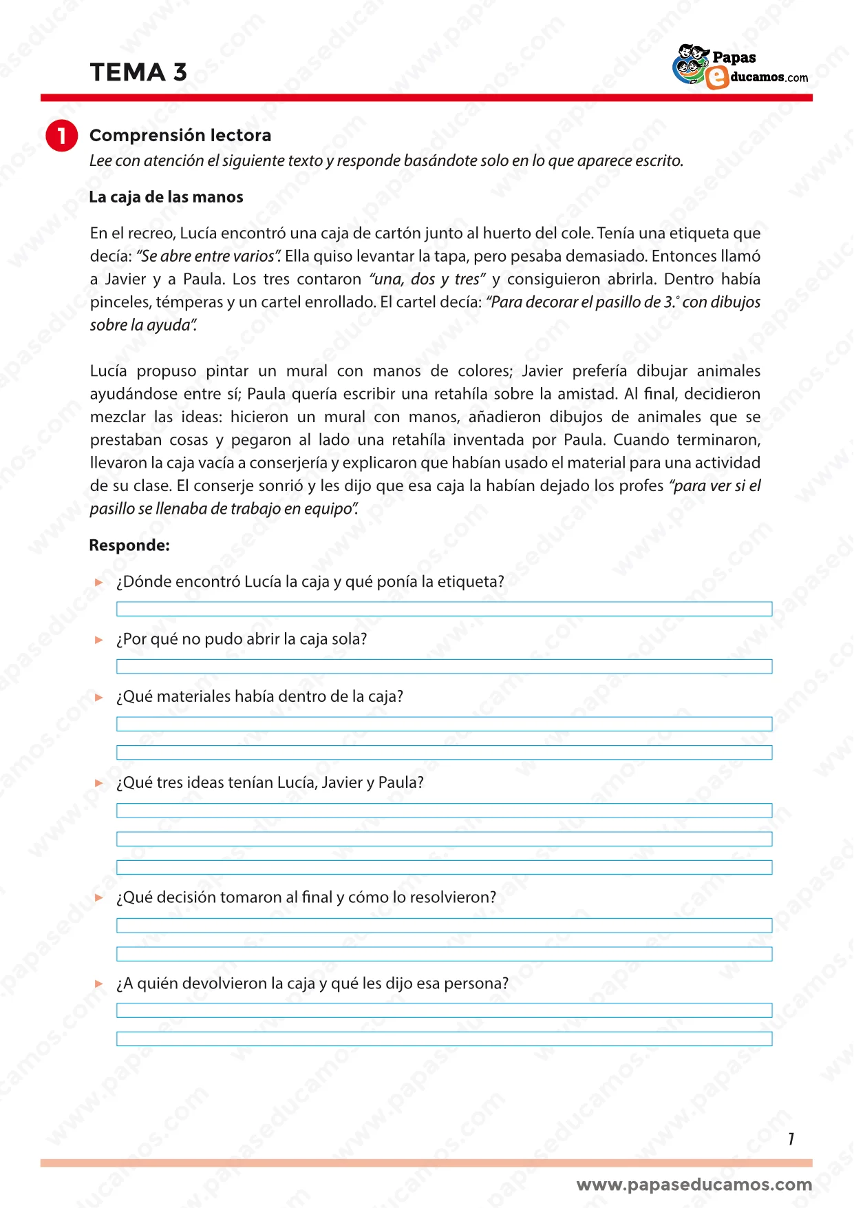 - Comprensión lectora: lectura del texto “La caja de las manos”, con preguntas de interpretación y reflexión sobre la colaboración y el trabajo en equipo.