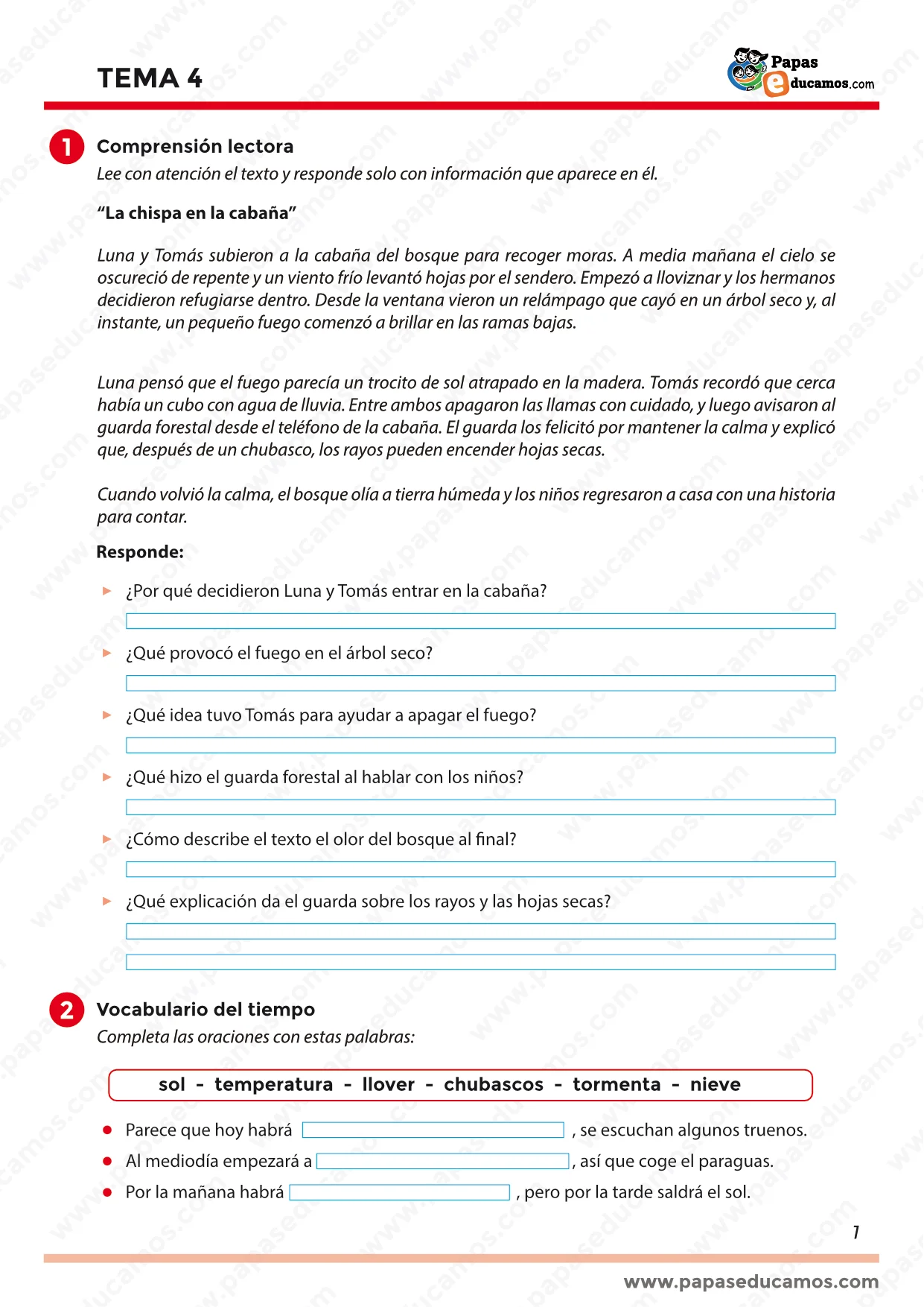 - Comprensión lectora: lectura del texto “La chispa en la cabaña”, con preguntas de interpretación literal y reflexiva sobre el cuidado del entorno y la calma ante situaciones inesperadas.