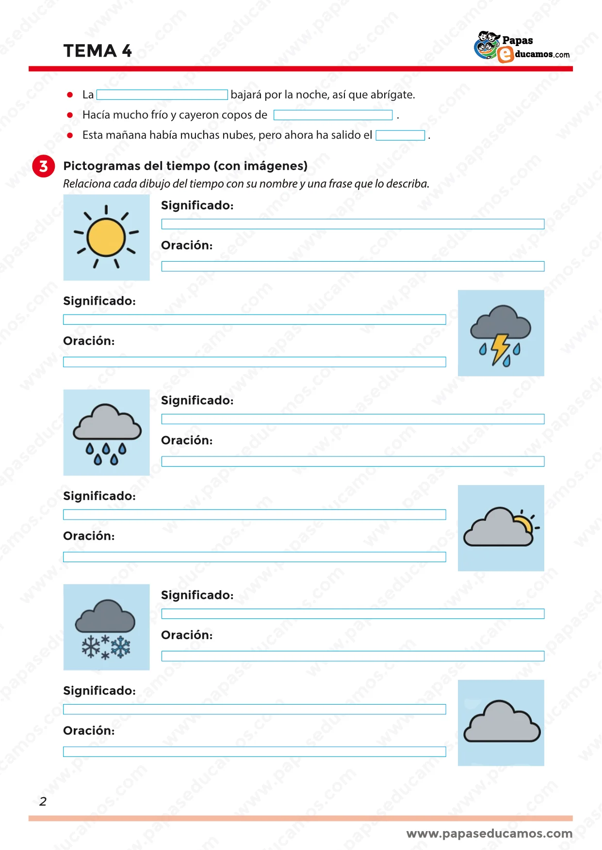 - Vocabulario del tiempo: ejercicios para completar oraciones y asociar pictogramas meteorológicos (sol, lluvia, tormenta, nieve…), ampliando el léxico cotidiano de forma visual y práctica.