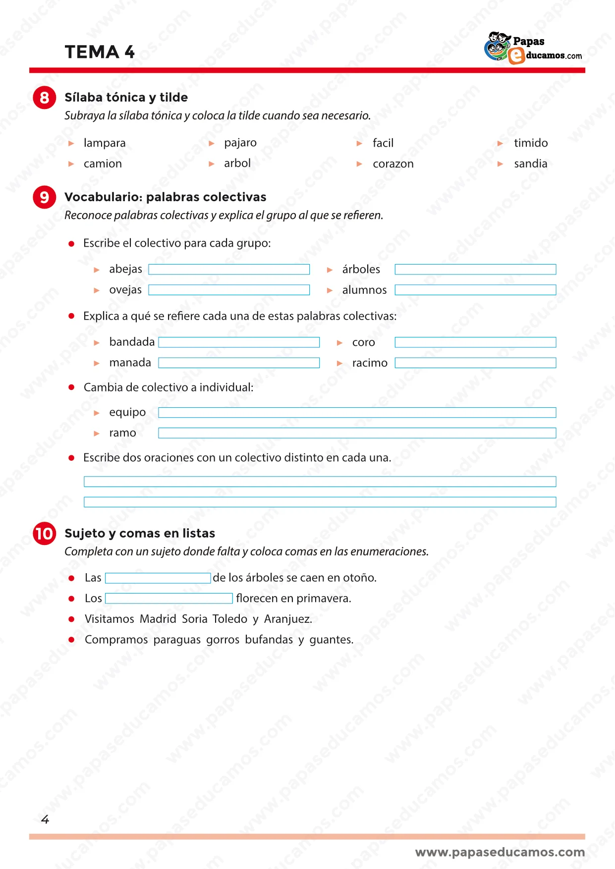 Además, trabajan el vocabulario de las palabras colectivas, comprendiendo cómo un solo término puede referirse a un conjunto de elementos. También practican el uso correcto de las comas en enumeraciones y la identificación del sujeto en las oraciones, mejorando su expresión escrita y gramatical.