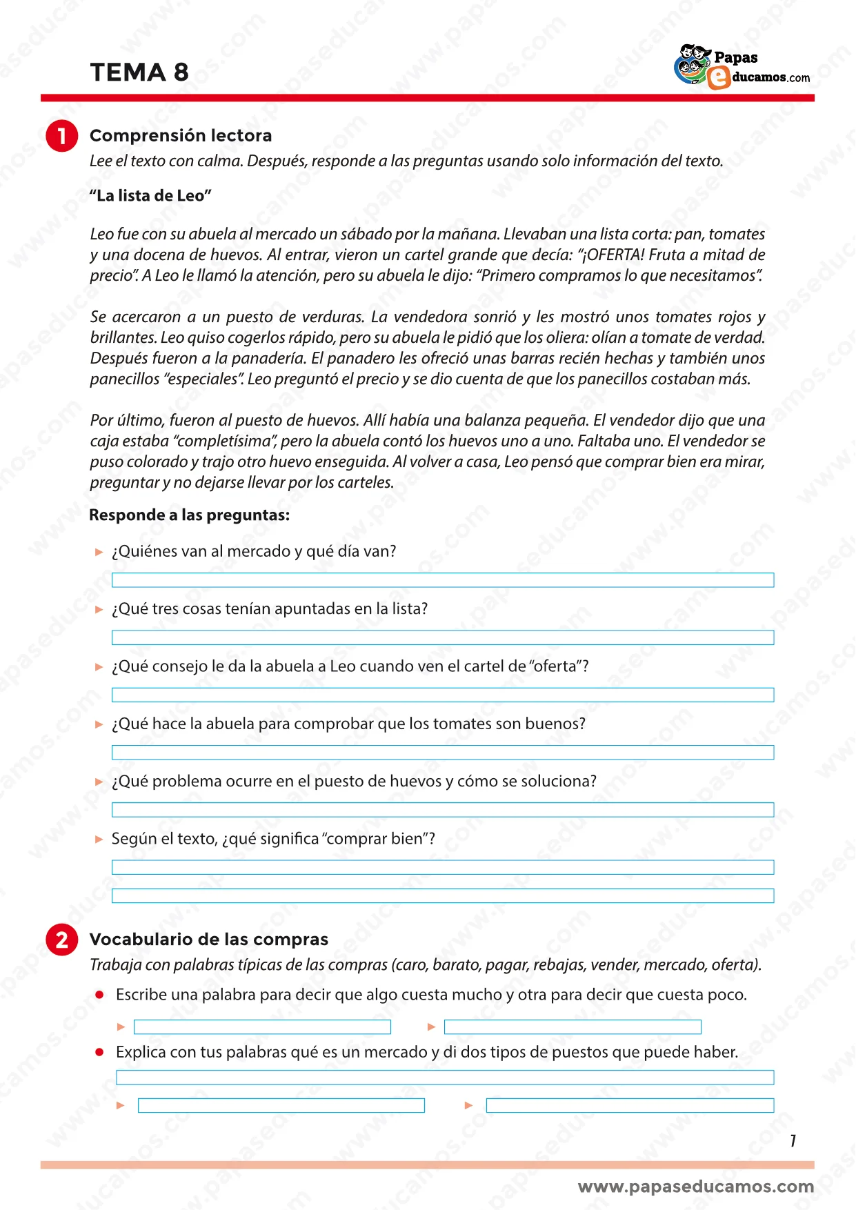 En este tema se trabaja la comprensión lectora con el texto “La lista de Leo”, donde el alumnado responde preguntas usando únicamente la información del cuento (quién va al mercado, qué compran, qué consejos da la abuela y qué significa “comprar bien”). A partir de ahí, se enlaza con una idea muy útil para su día a día: no dejarse llevar por carteles de oferta, observar, preguntar y comprobar lo que se compra.