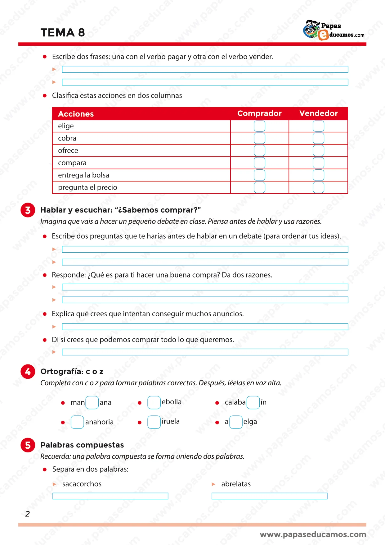 Después se refuerza el vocabulario de las compras (caro/barato, pagar, vender, rebajas, mercado, oferta), escribiendo definiciones y frases, y clasificando acciones propias del comprador y del vendedor. Por otro lado, se potencia la expresión oral y la escucha con un pequeño debate: preparar preguntas antes de hablar, explicar qué es una buena compra con razones, reflexionar sobre lo que buscan los anuncios y pensar si siempre podemos comprar todo lo que queremos.
