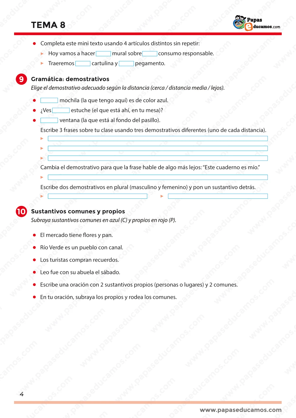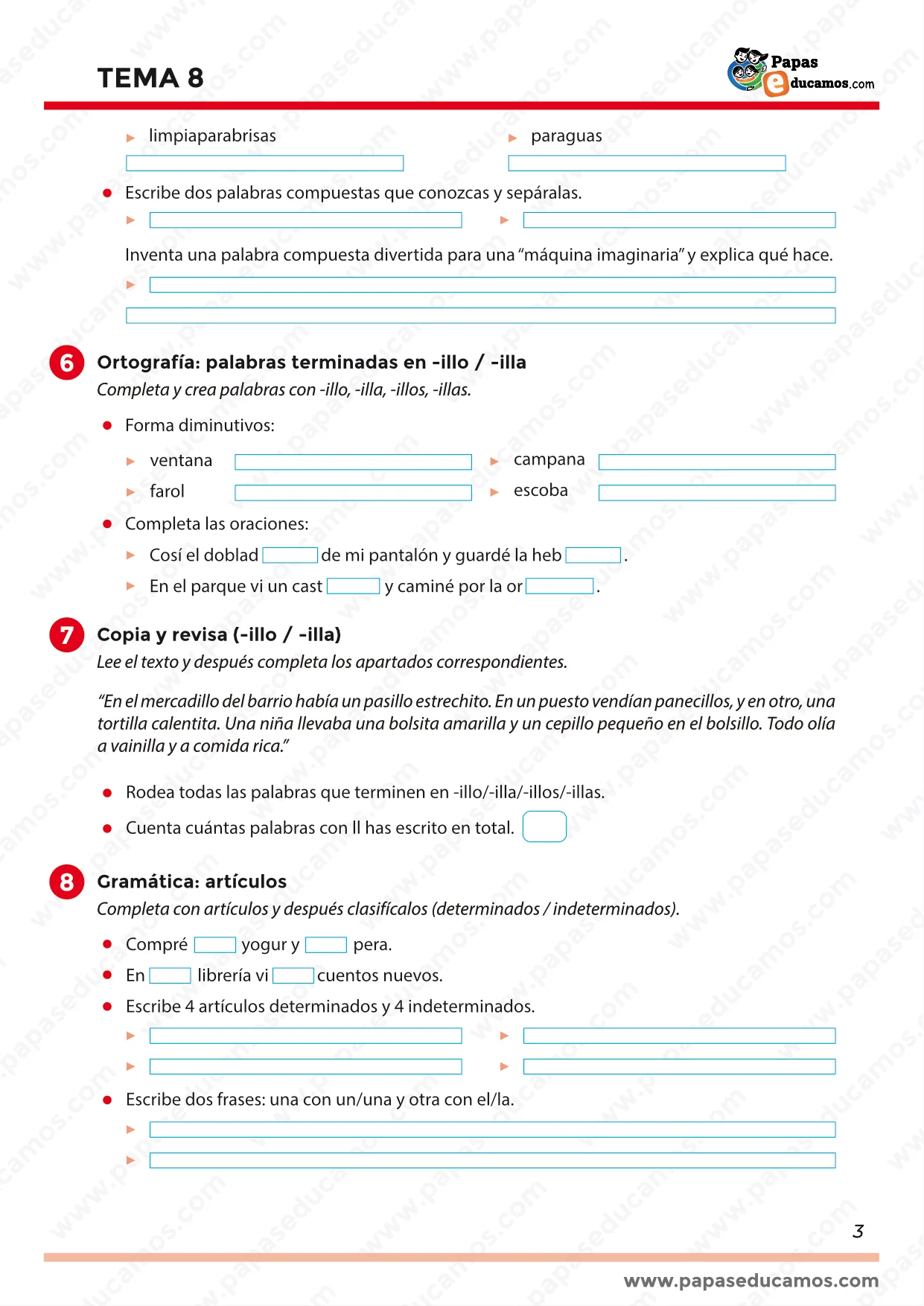 Además, se repasa ortografía completando palabras con c o z, y se trabajan las palabras compuestas separándolas en dos (y creando otras nuevas, incluso inventando una “máquina imaginaria”). También se practican los diminutivos y terminaciones -illo / -illa (formar palabras, completar oraciones y revisar un texto identificando palabras con esas terminaciones). En gramática, se completan y clasifican artículos (determinados e indeterminados), se redactan frases con distintos artículos y se completa un mini texto sin repetirlos. Finalmente, se trabajan los demostrativos según la distancia, y los sustantivos comunes y propios, identificándolos en oraciones y creando una propia con ambos tipos.