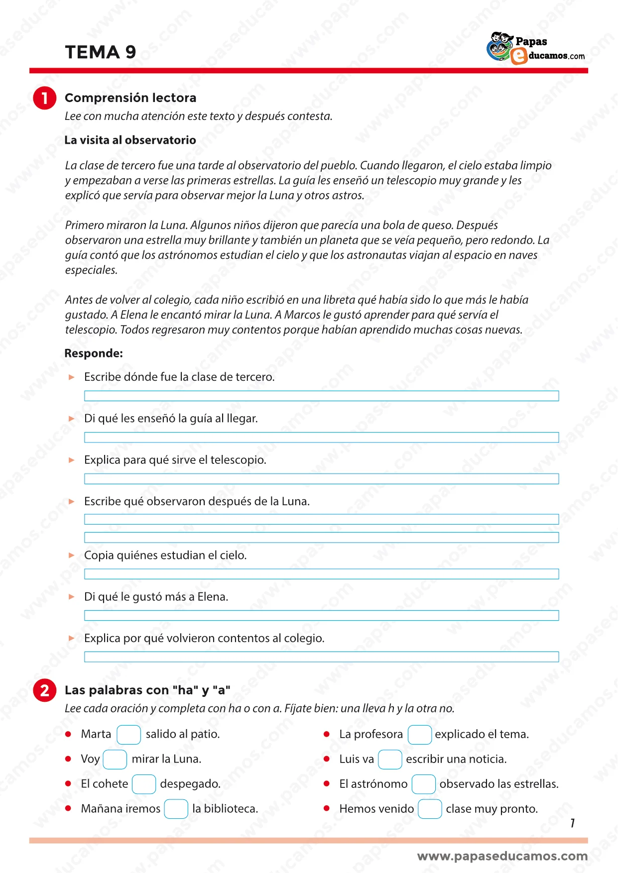 Se empieza con la lectura “La visita al observatorio”, donde el alumnado responde preguntas usando solo la información del texto (lugar, qué les enseñó la guía, para qué sirve el telescopio, qué observaron y qué aprendieron).