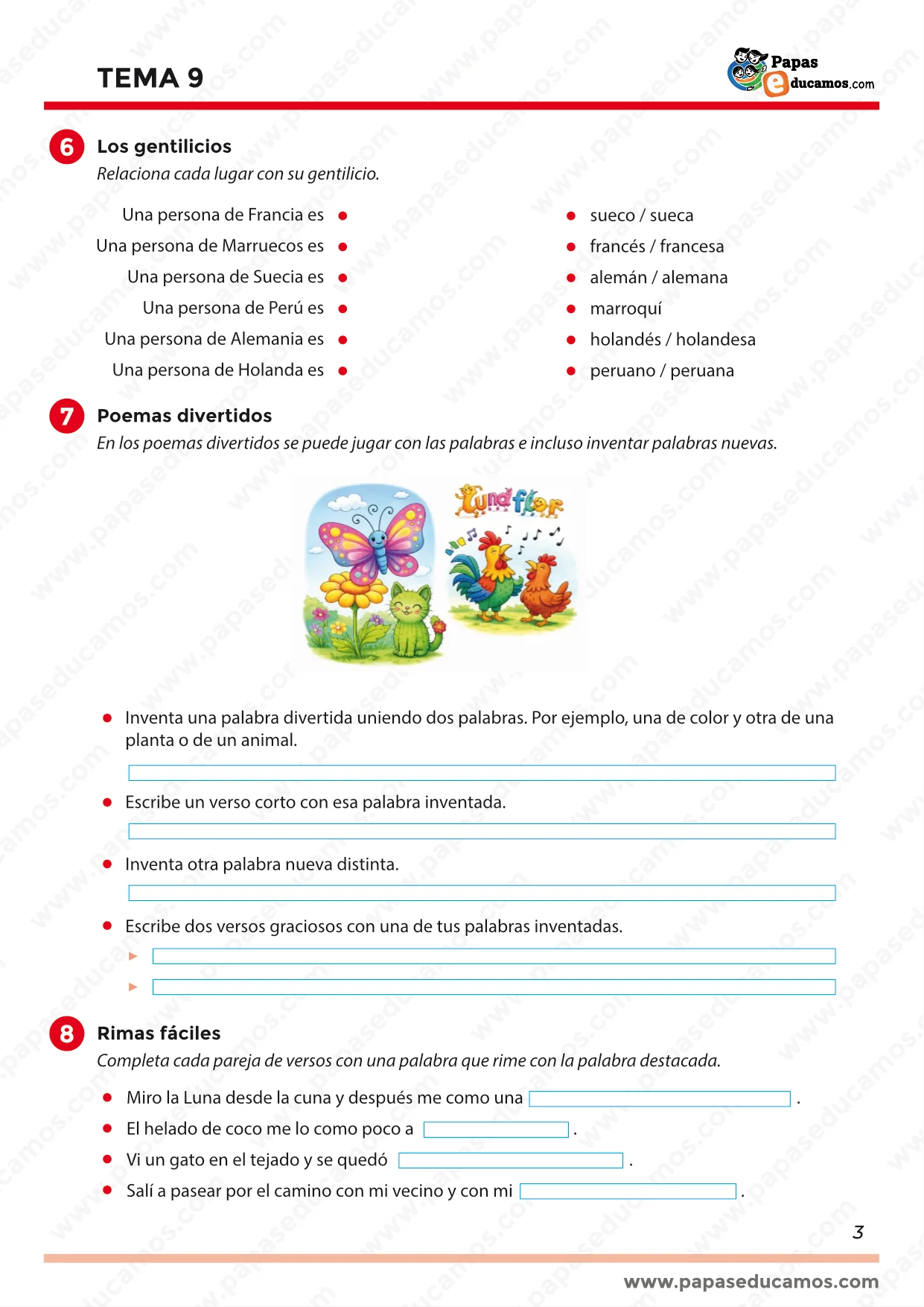 En gramática se trabajan los posesivos (mi, tu, nuestro, sus…), completando frases y creando oraciones nuevas. Además, se repasan gentilicios relacionando países con su forma correcta (francés, marroquí, sueco, peruano, alemán, holandés).