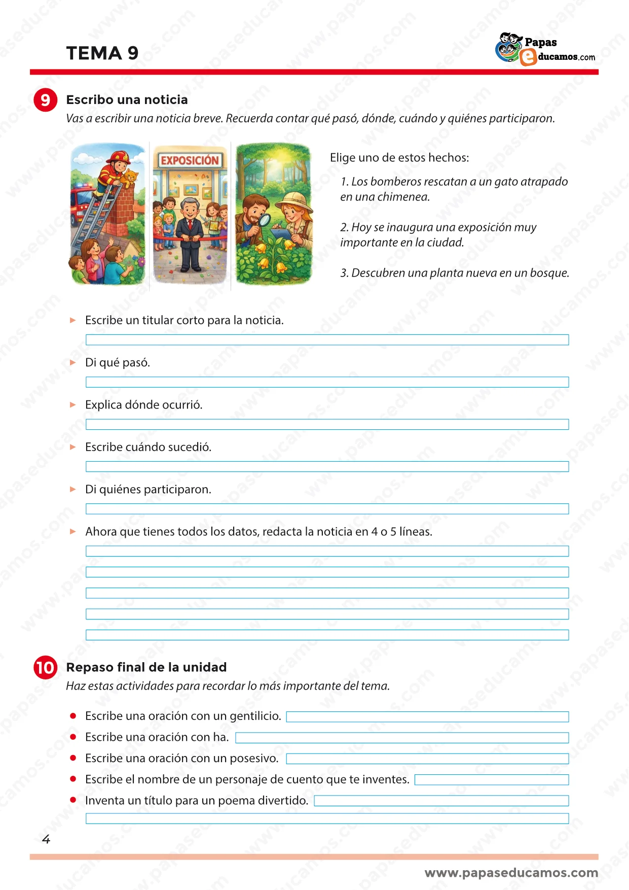 En el Tema 9 se trabaja la comprensión lectora, la ortografía y la expresión escrita con actividades cortas y muy prácticas, ideales para avanzar sin agobios cuando en casa hay poco tiempo.