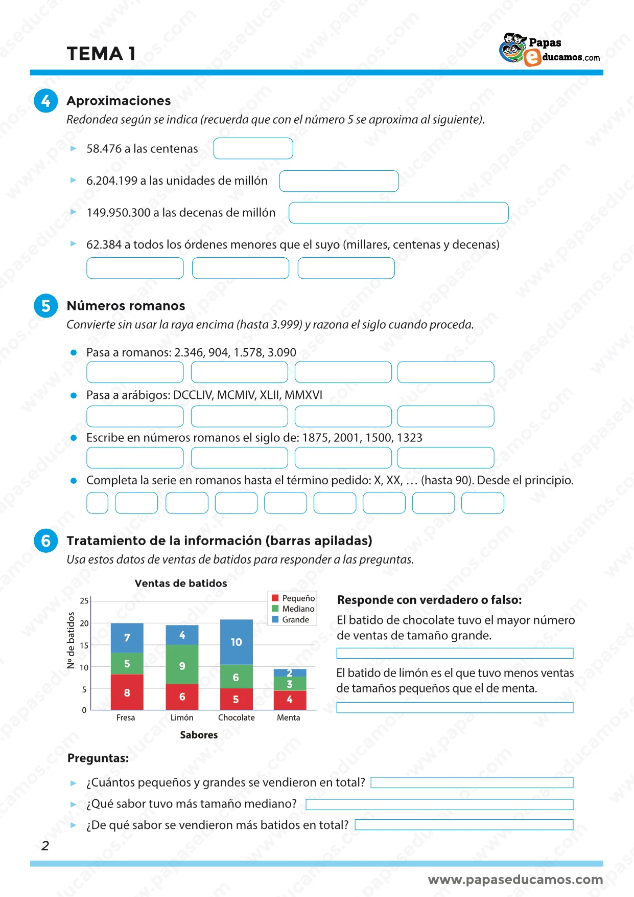 Este tema trabaja la lectura, escritura y descomposición de números de hasta 9 cifras, permitiendo a los alumnos comprender su valor posicional. Incluye actividades de comparación y ordenación de números grandes, así como la práctica con aproximaciones y redondeos a distintos órdenes de magnitud.