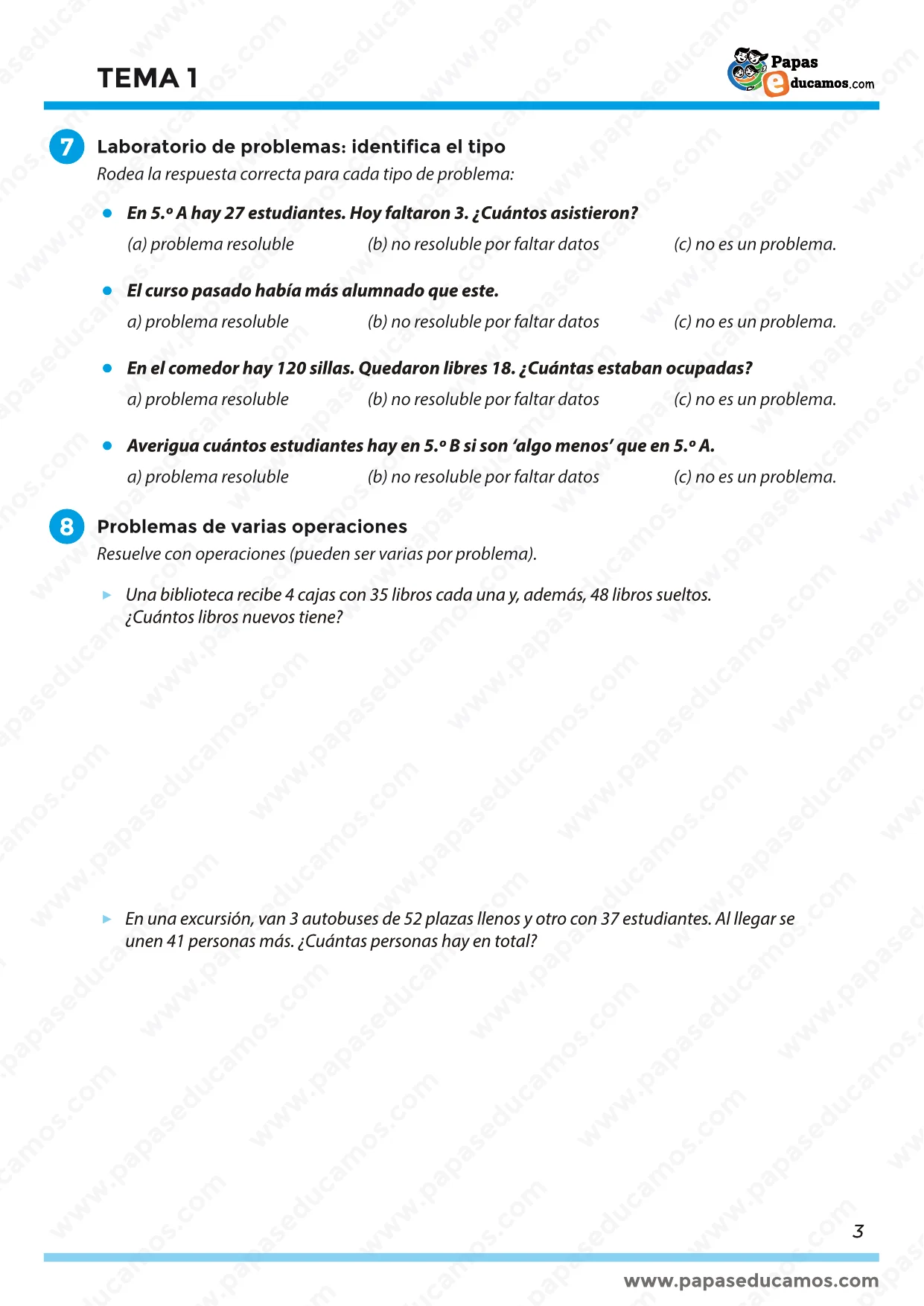 El tema incorpora el tratamiento de la información mediante gráficos y tablas, reforzando la interpretación de datos. Además, se trabajan distintos tipos de problemas matemáticos (resolubles, no resolubles o sin datos suficientes) y se presentan problemas de varias operaciones, que requieren combinar sumas, restas, multiplicaciones y divisiones.
