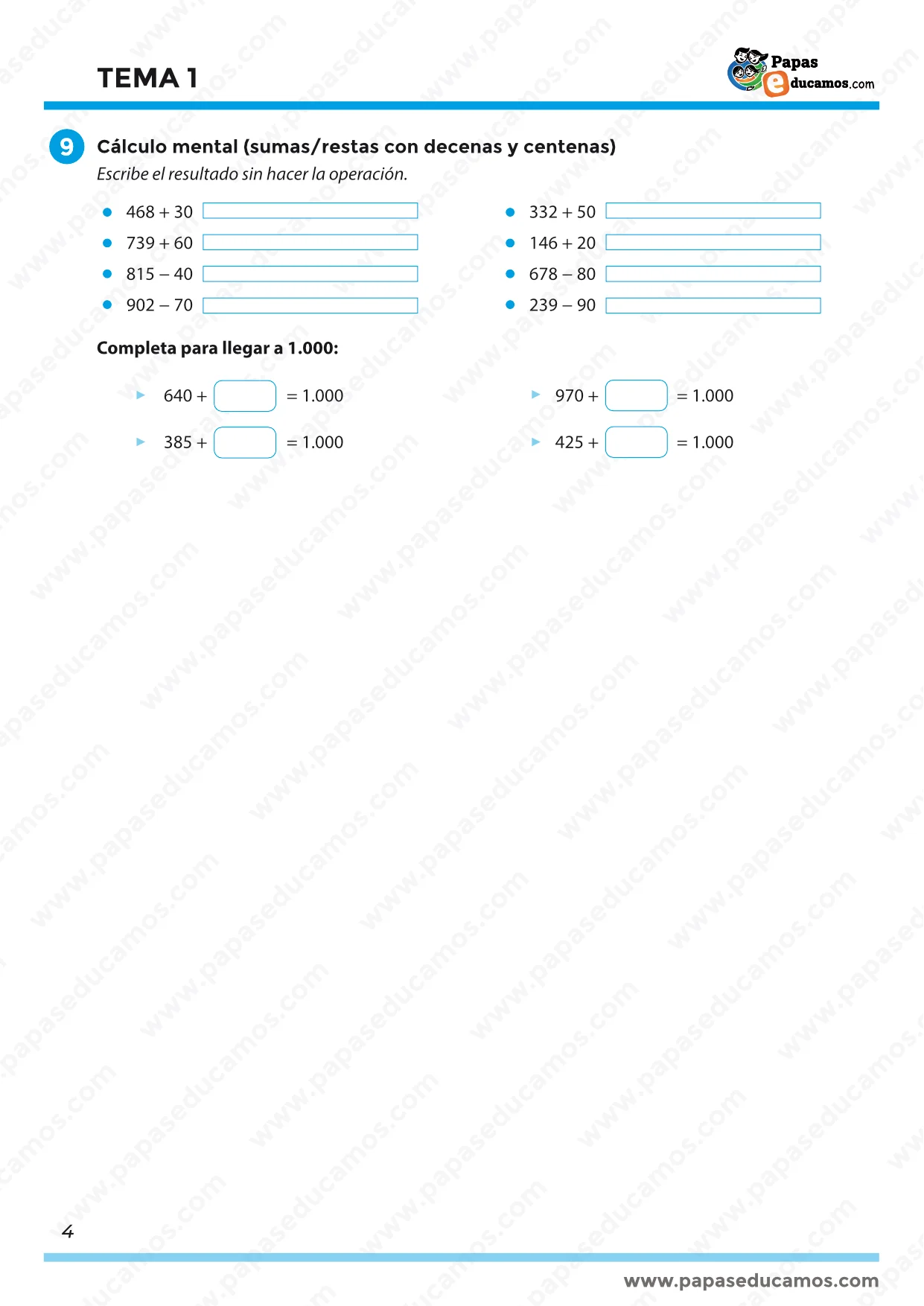 Finalmente, se potencia el cálculo mental con sumas y restas rápidas de decenas y centenas, favoreciendo la agilidad numérica.