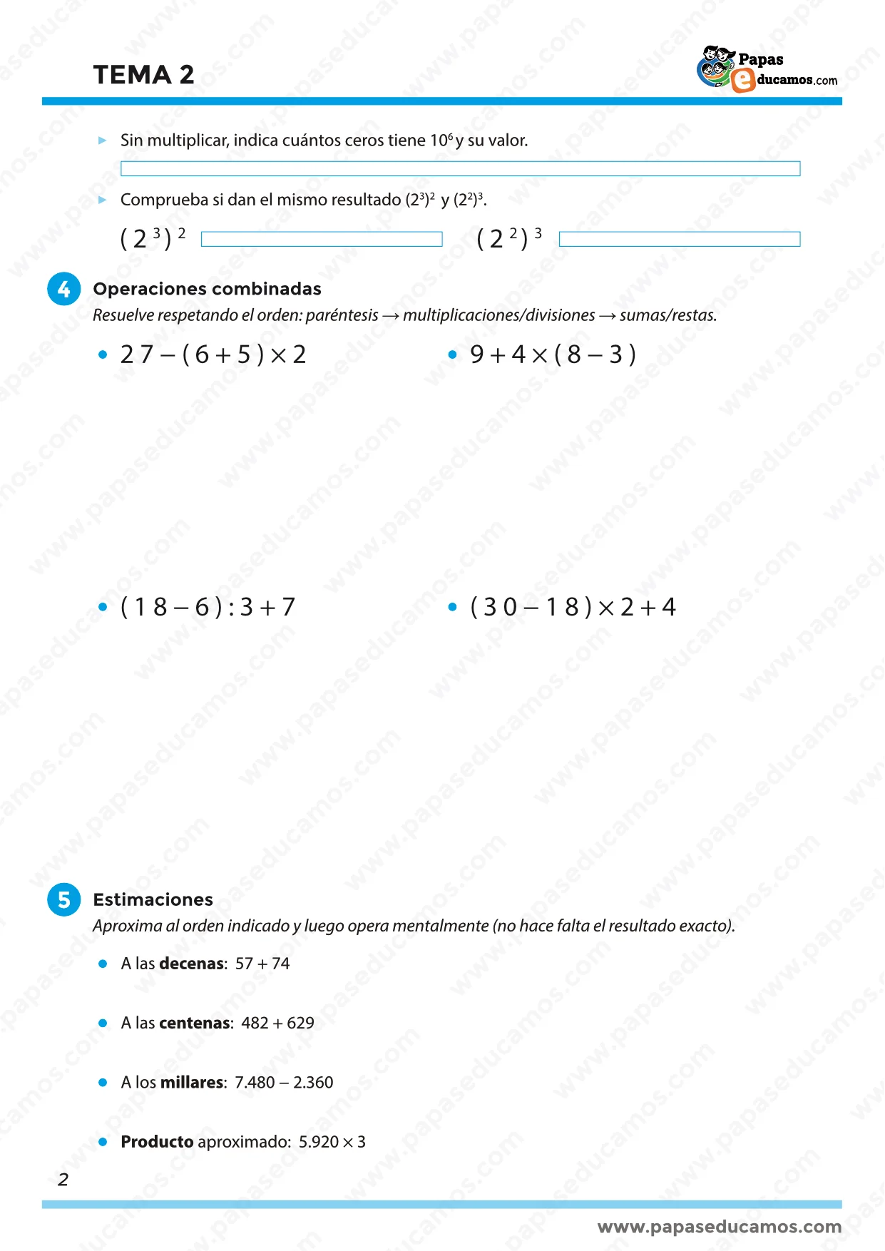Ejercicios para practicar el orden de las operaciones (paréntesis, multiplicaciones/divisiones, sumas/restas) y para estimar resultados aproximados redondeando a decenas, centenas o millares.