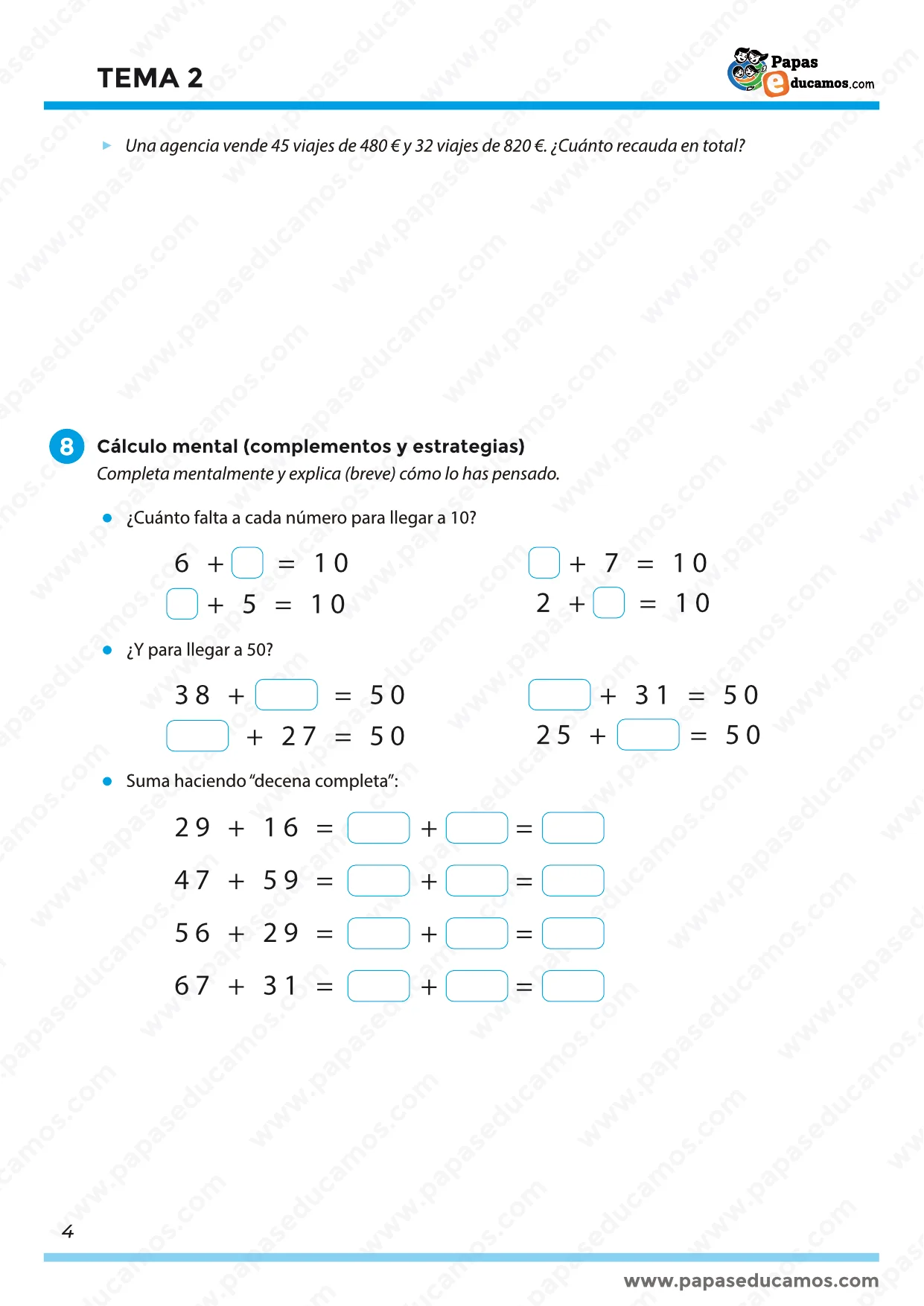 Problemas aplicados a situaciones cotidianas, como el transporte o el dinero, y ejercicios de cálculo mental que refuerzan la agilidad y la lógica matemática mediante estrategias de complementos y decenas completas.