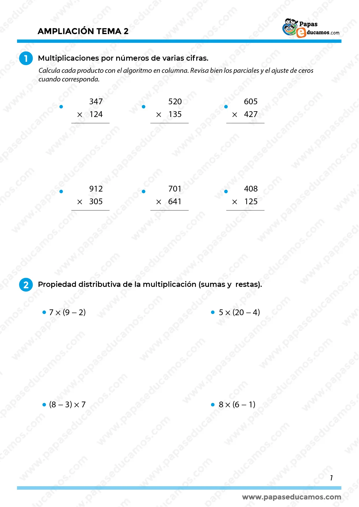 Propiedad distributiva: ejercicios para comprender cómo aplicar la multiplicación respecto a la suma o la resta, simplificando cálculos y favoreciendo la lógica matemática.