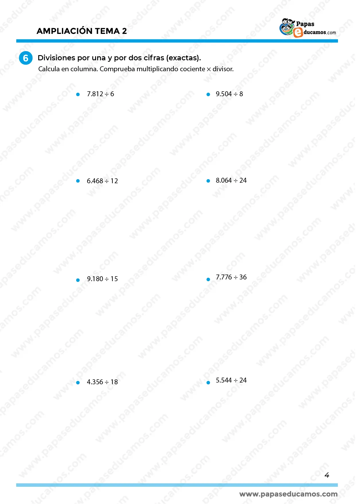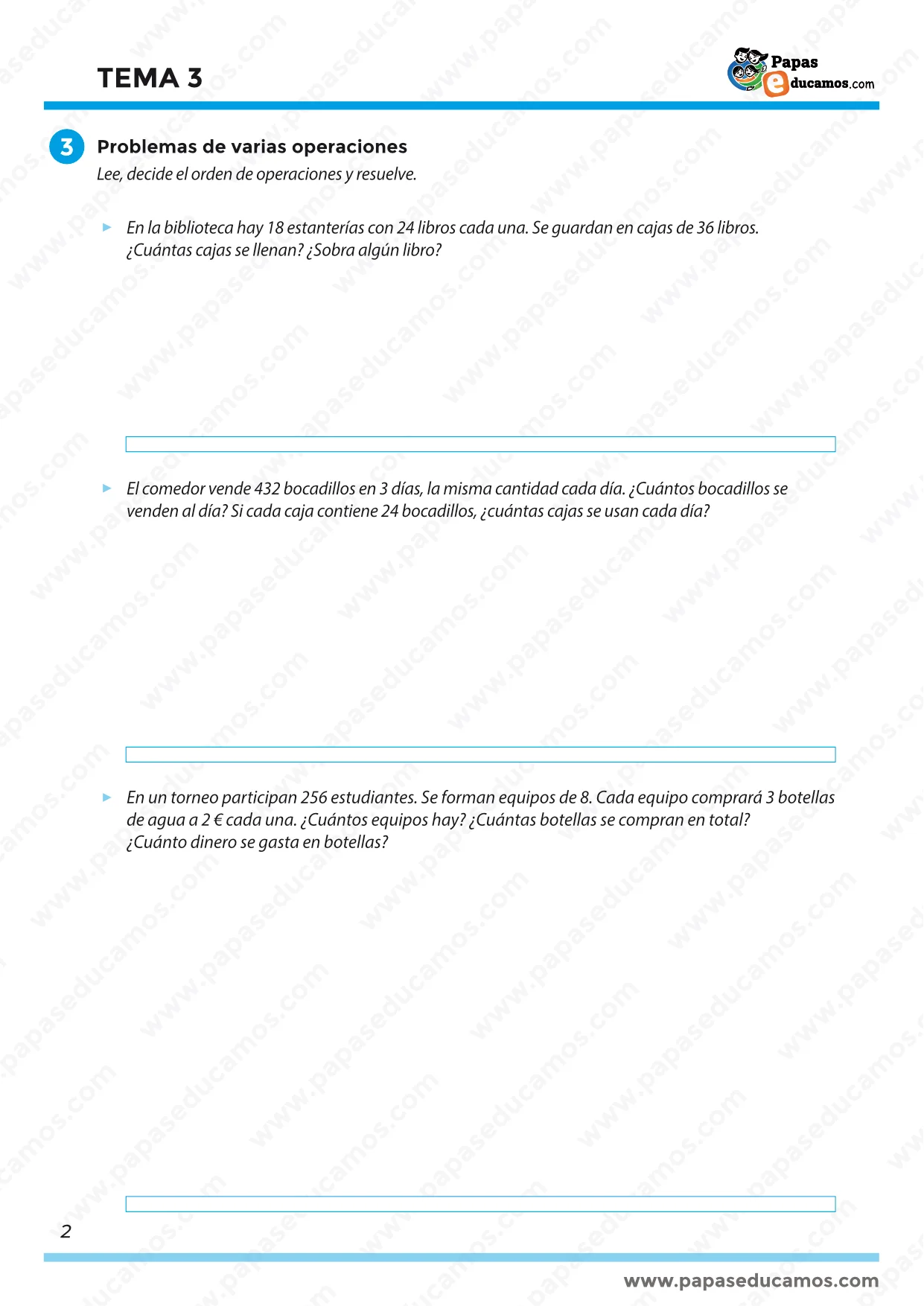 El Tema 3 trabaja divisiones de dos y tres cifras, ayudando al alumnado a calcular y comprobar resultados, además de identificar cuándo una división es exacta. También incluye problemas con varias operaciones, que requieren decidir el orden correcto para resolver situaciones reales como repartir libros, calcular bocadillos diarios o estimar gastos en un torneo escolar.