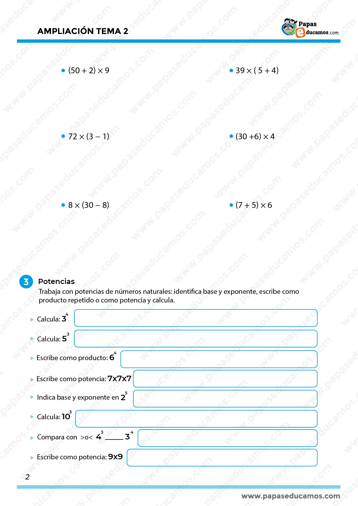 Potencias: fichas para trabajar la base y el exponente, aprender a leer potencias (“al cuadrado”, “al cubo”) y comprender su relación con la multiplicación repetida.