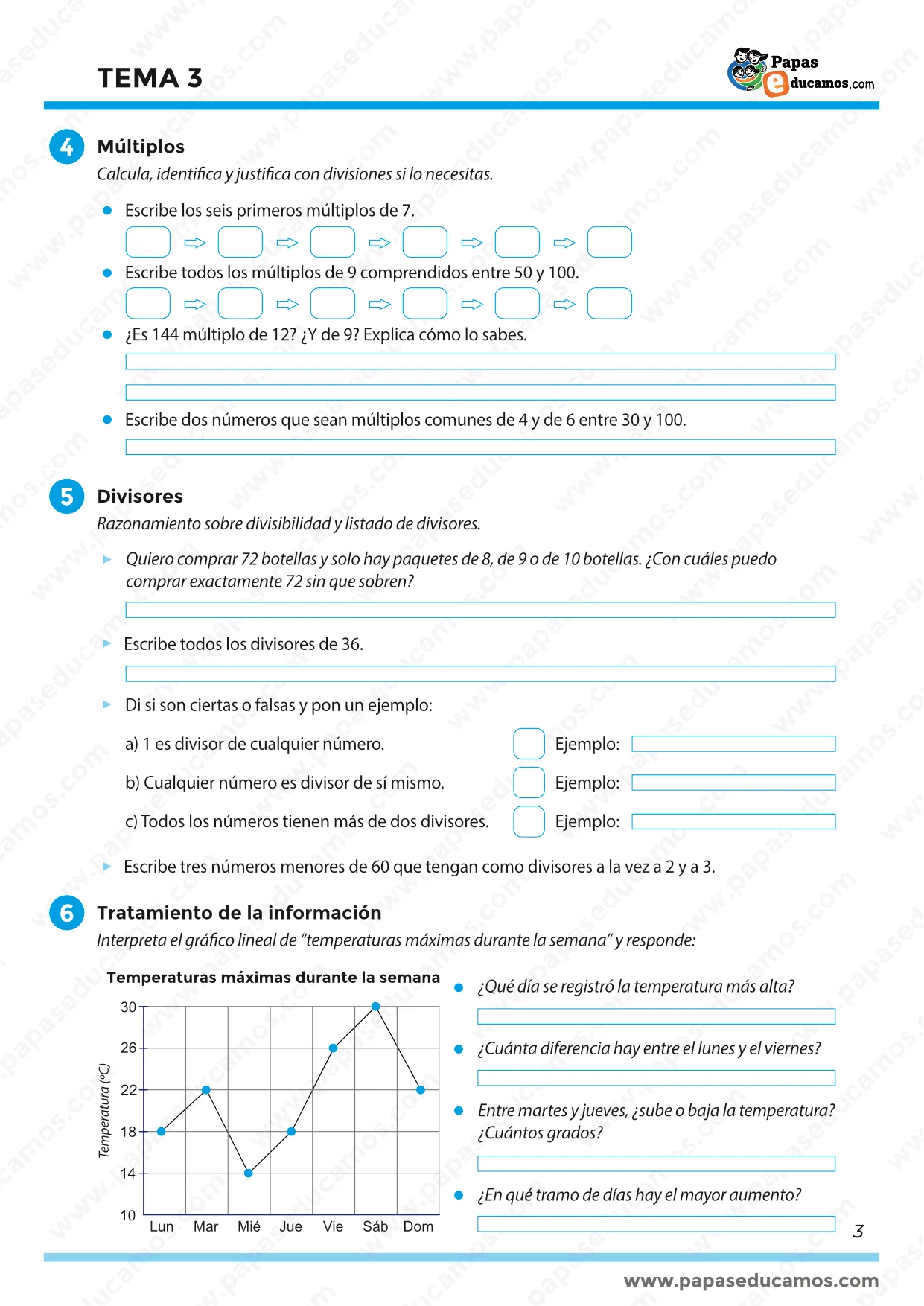 El tema incorpora también tratamiento de la información mediante un gráfico de temperaturas semanales que los alumnos deben interpretar para comparar datos y sacar conclusiones. Por último, se trabajan las relaciones entre múltiplos y divisores, completando frases y verificando cada caso con operaciones sencillas.
