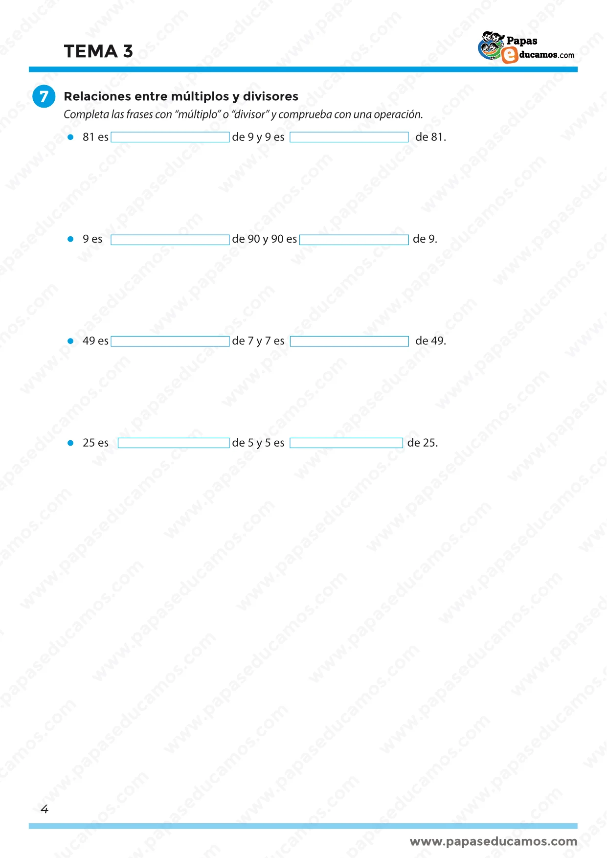 Además, se profundiza en múltiplos y divisores, identificando múltiplos de distintos números, justificando si un número pertenece a una serie y analizando la divisibilidad mediante ejemplos prácticos. Los estudiantes listan divisores, comprueban afirmaciones y buscan números con divisores específicos.