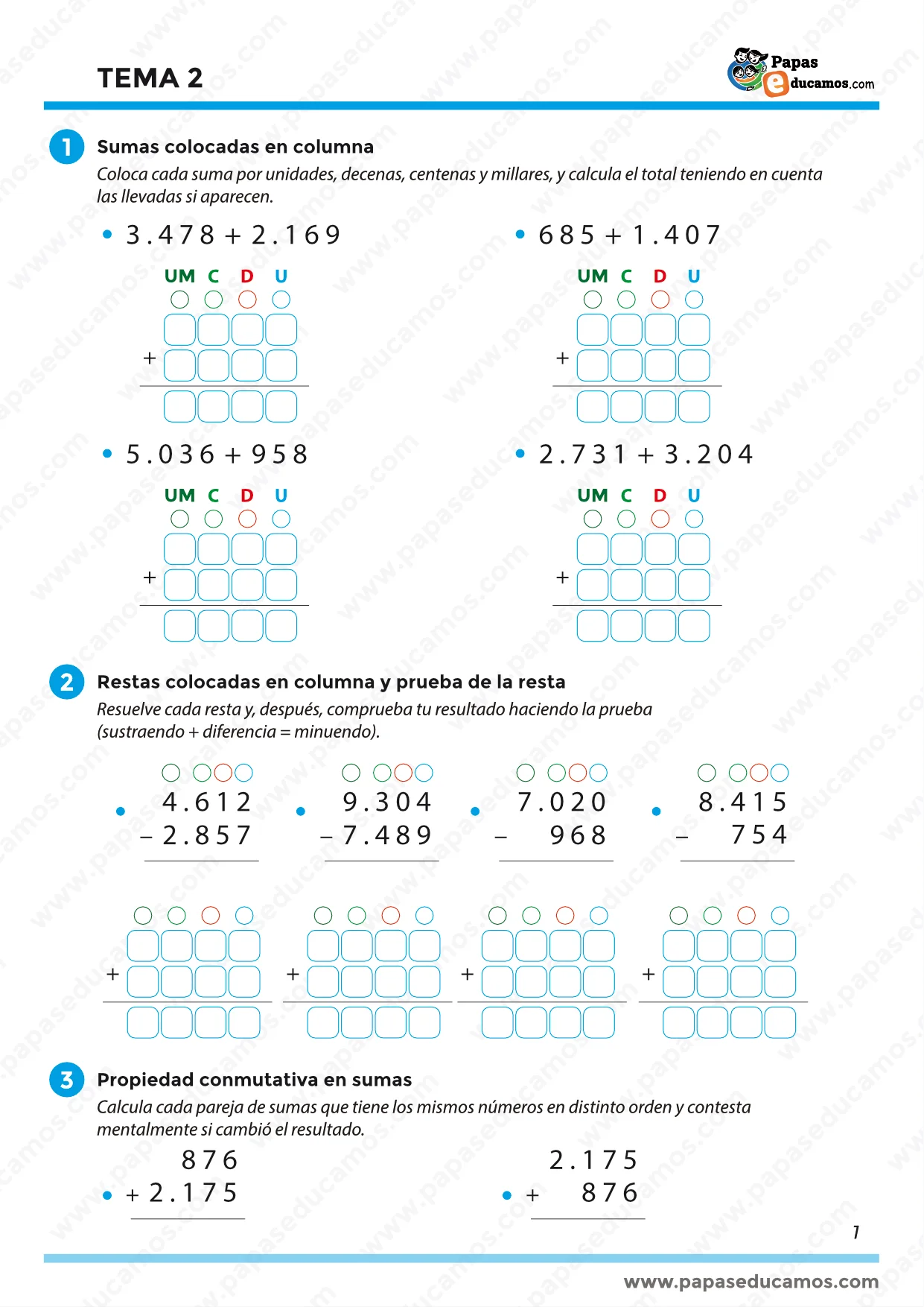 - Sumas y restas en columna: ejercicios para practicar operaciones con unidades, decenas, centenas y millares, aplicando correctamente las llevadas.