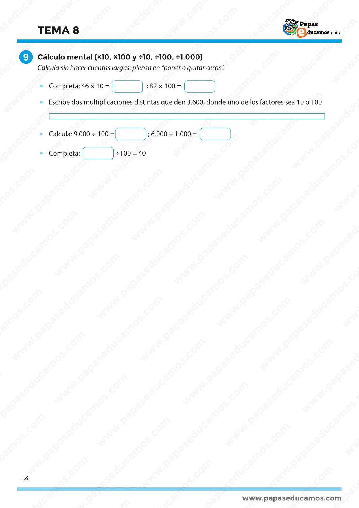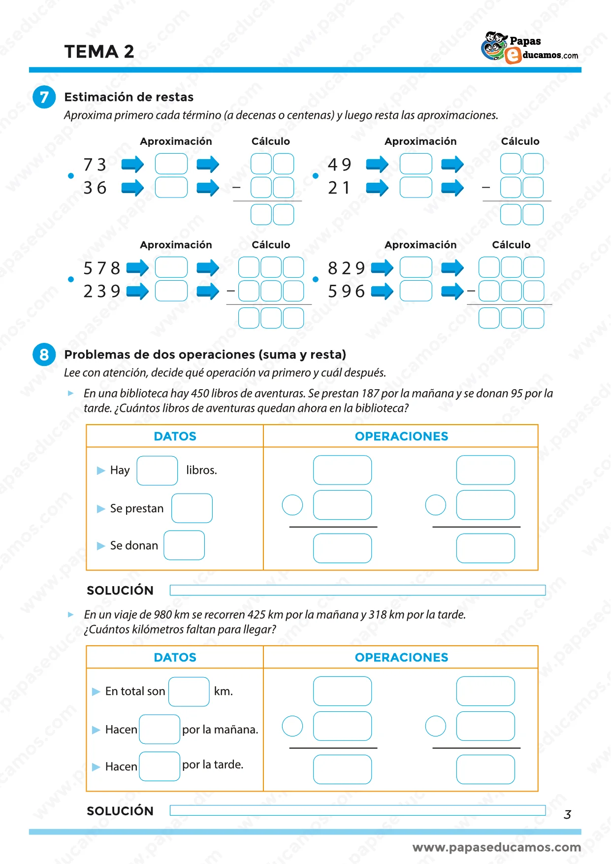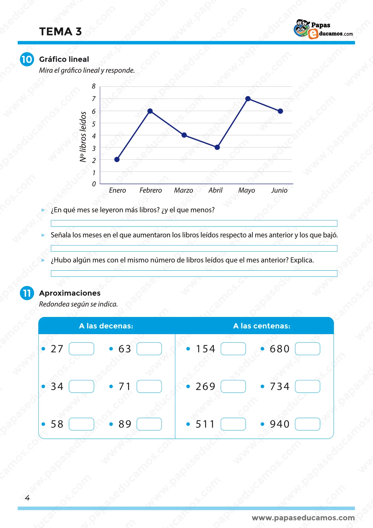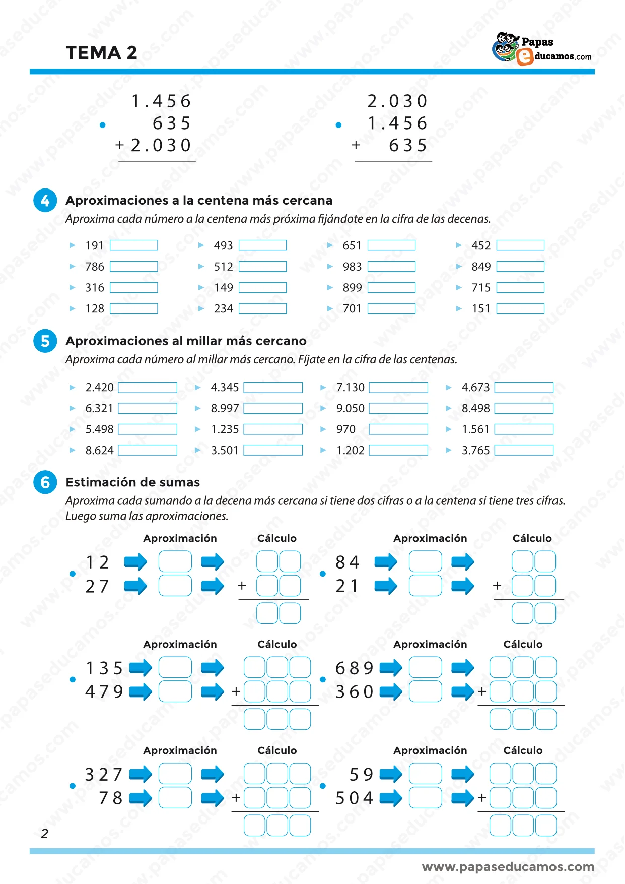 - Aproximaciones y estimaciones: actividades de redondeo a la centena o al millar más cercano, y ejercicios para estimar resultados de forma rápida y razonada.