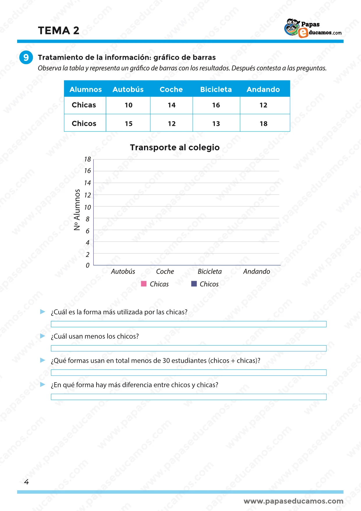 Por último, se introduce el tratamiento de la información mediante la lectura e interpretación de un gráfico de barras y su tabla asociada, desarrollando la capacidad de razonar y tomar decisiones a partir de datos.