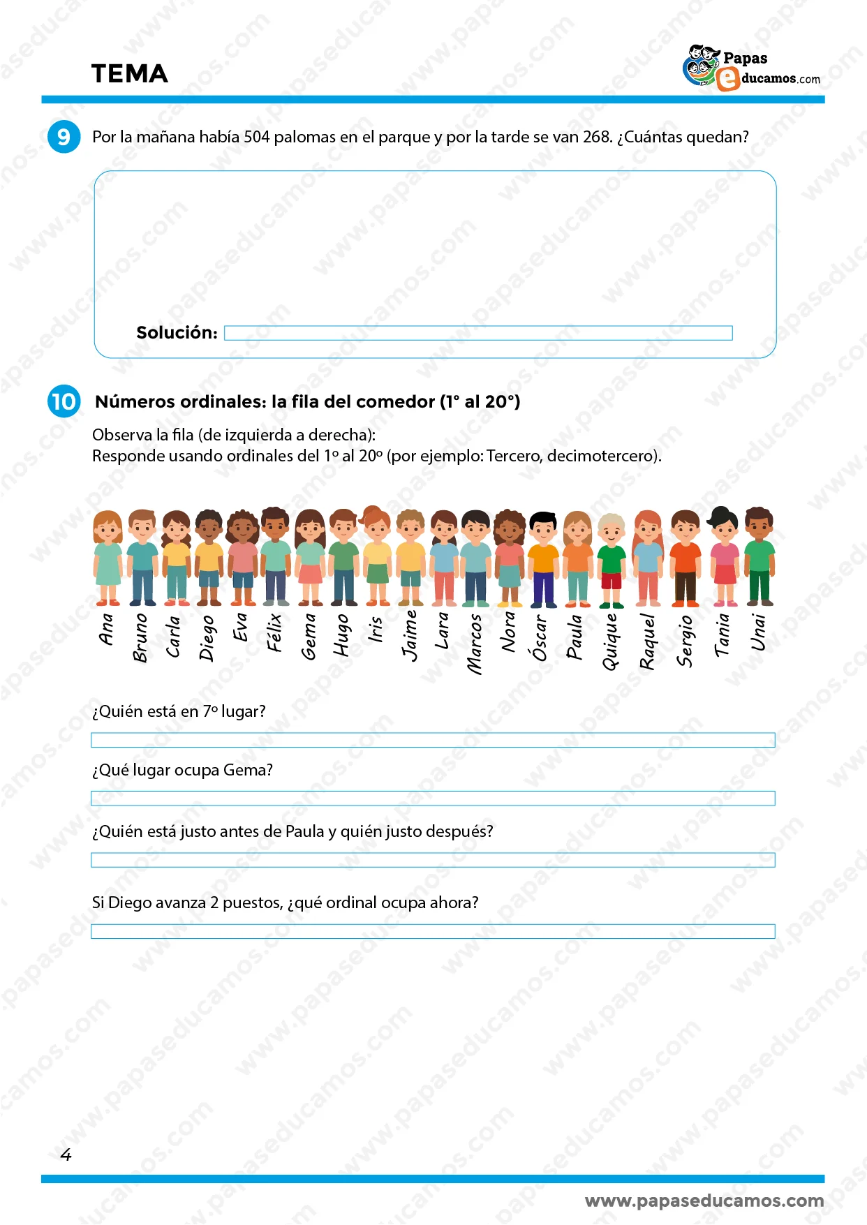 El material incluye una serie de problemas con operaciones básicas (sumas, restas y pesos), así como actividades para practicar el uso de los números ordinales del 1º al 20º de forma divertida y visual.