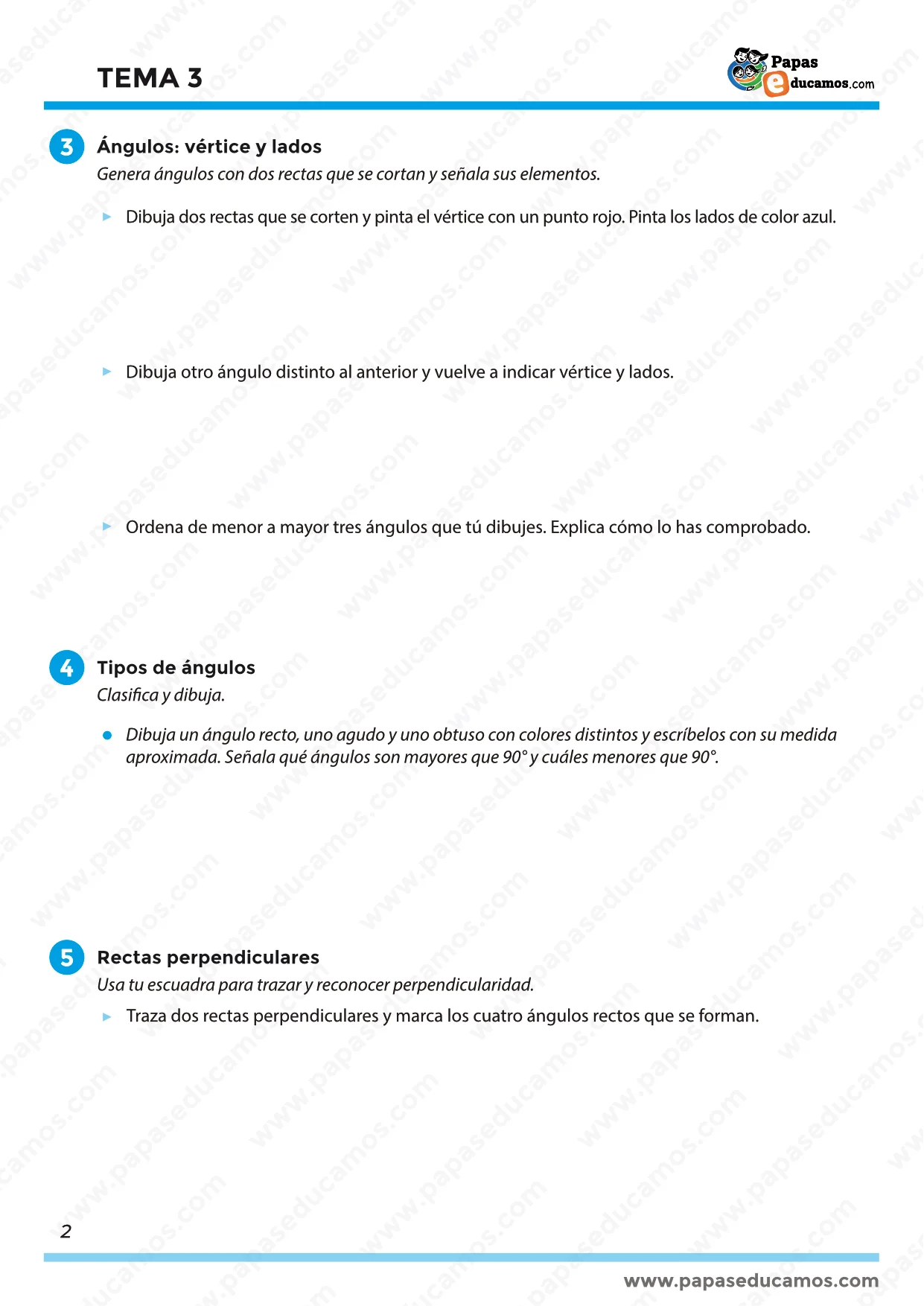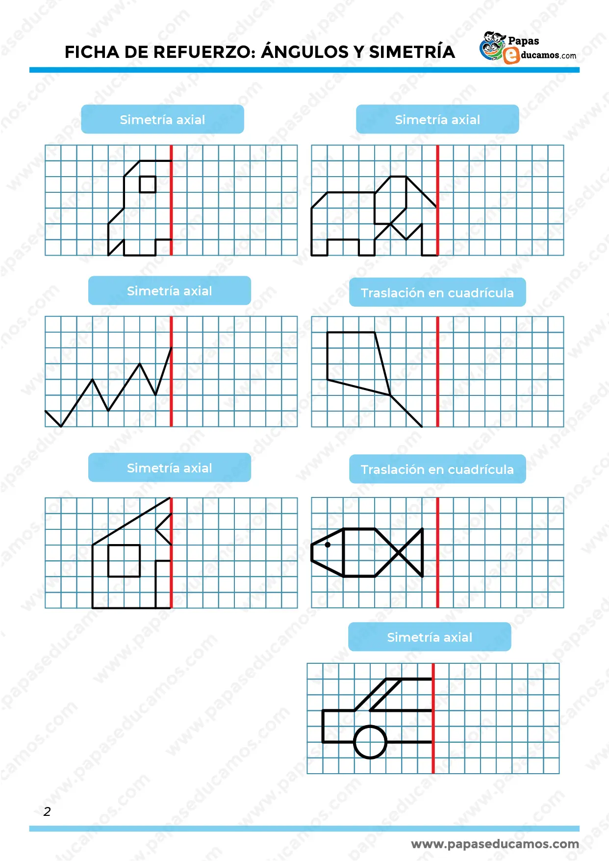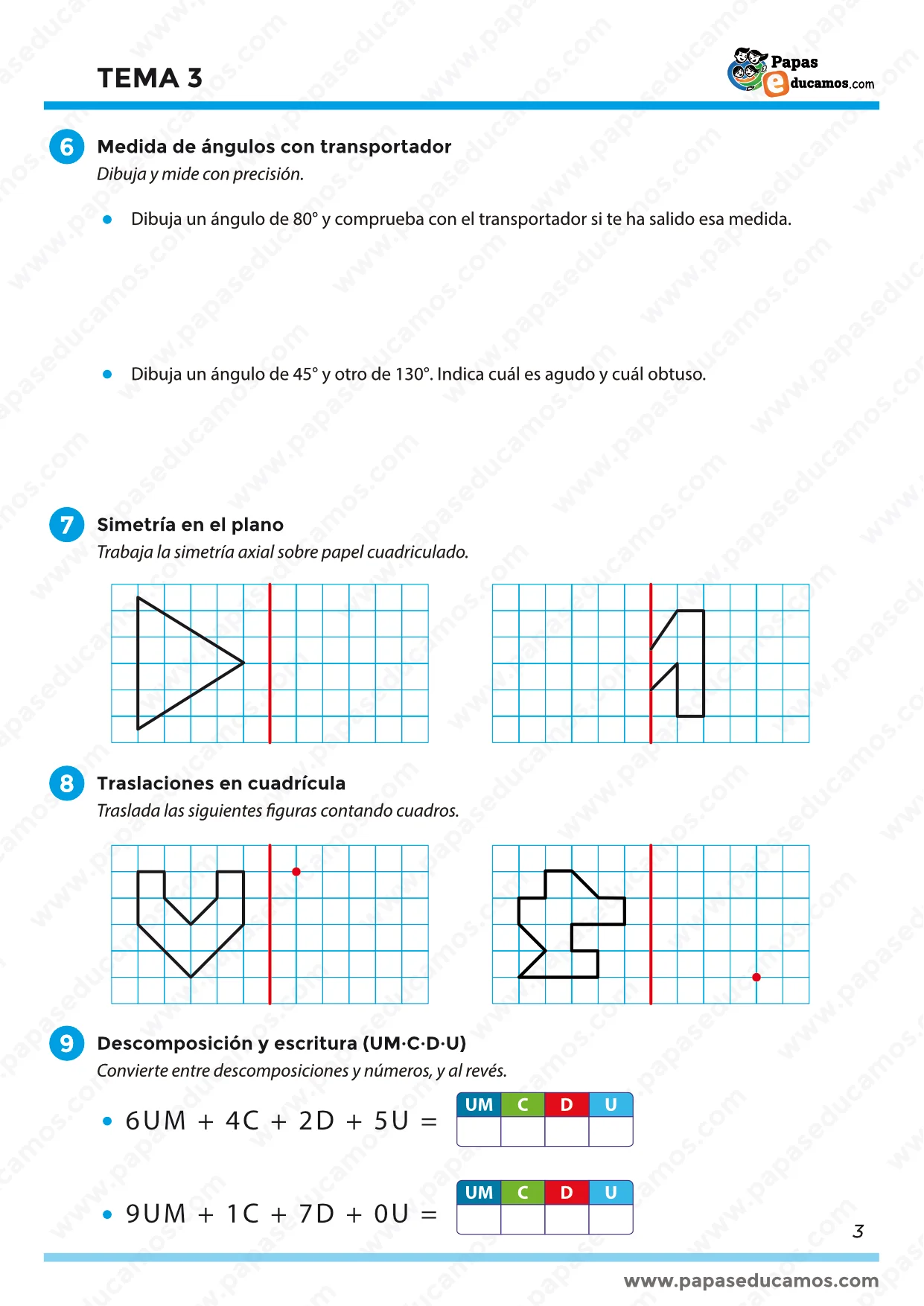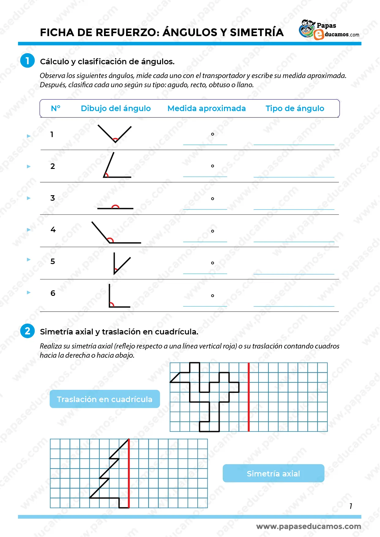Esta ficha complementaria del Tema 3 de Matemáticas (3º de Primaria) está diseñada para reforzar los conceptos de ángulos y simetría axial, favoreciendo la comprensión visual y la precisión geométrica.