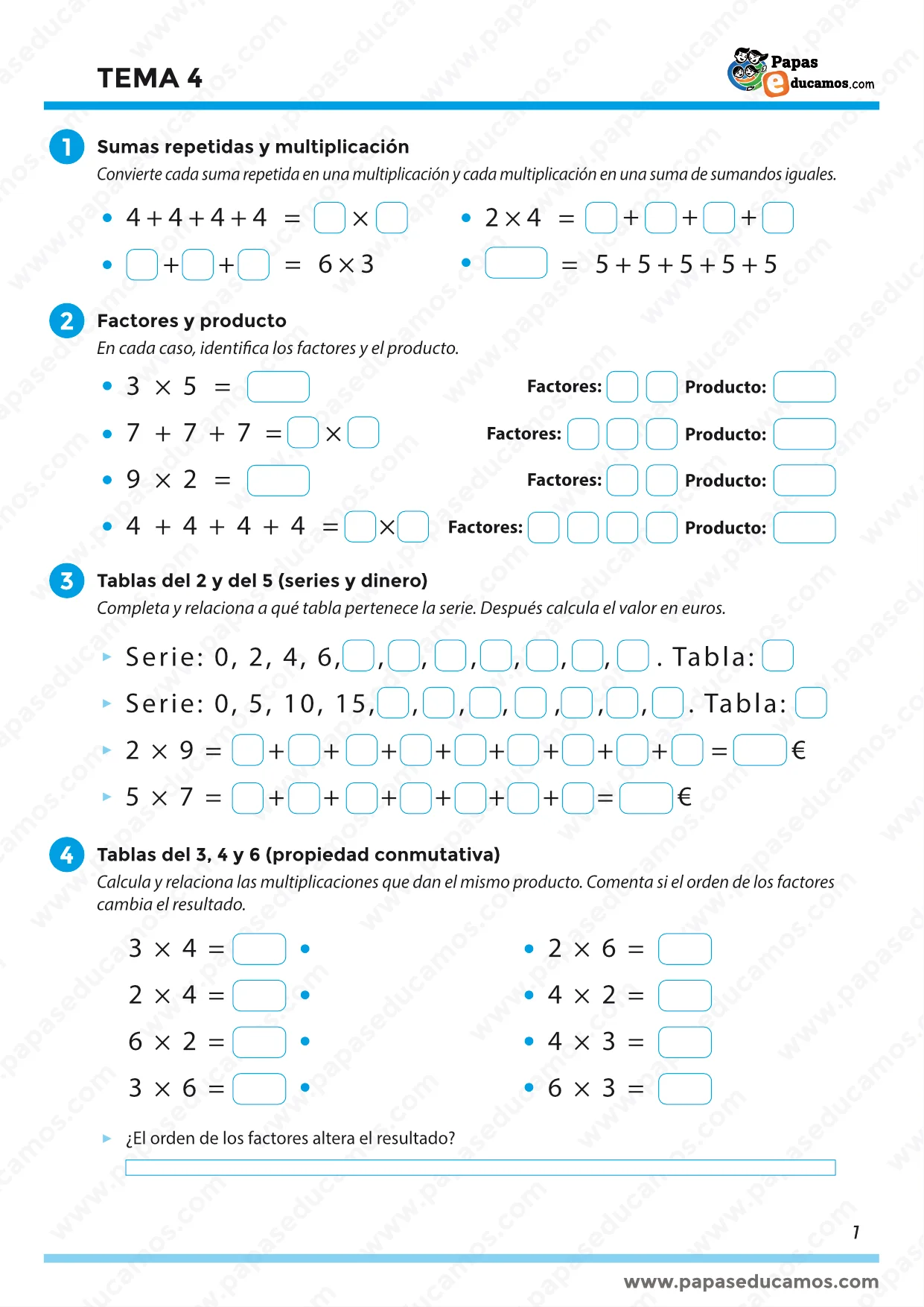 A través de ejercicios progresivos, se introduce la propiedad conmutativa, el cálculo del doble y el triple, y las multiplicaciones con varios factores, fomentando la comprensión del proceso y no solo la memorización.